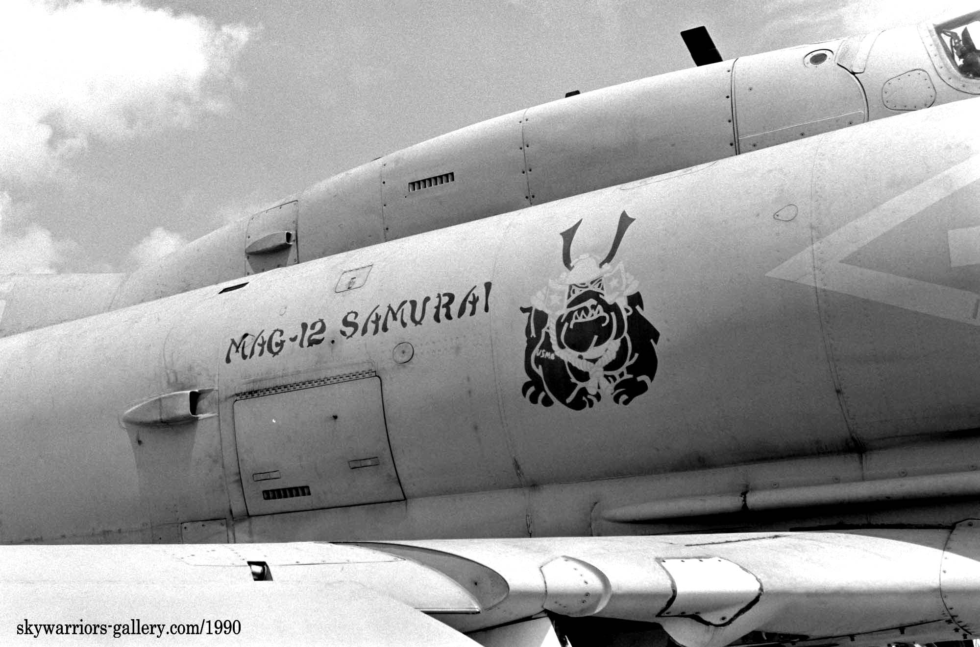 ↑ 1990年岩国基地航空祭で展示されたOA-4M /WA-03の背中に書かれたMAG-12 SAMURAI マーク。何故かブルドッグに兜姿・・・