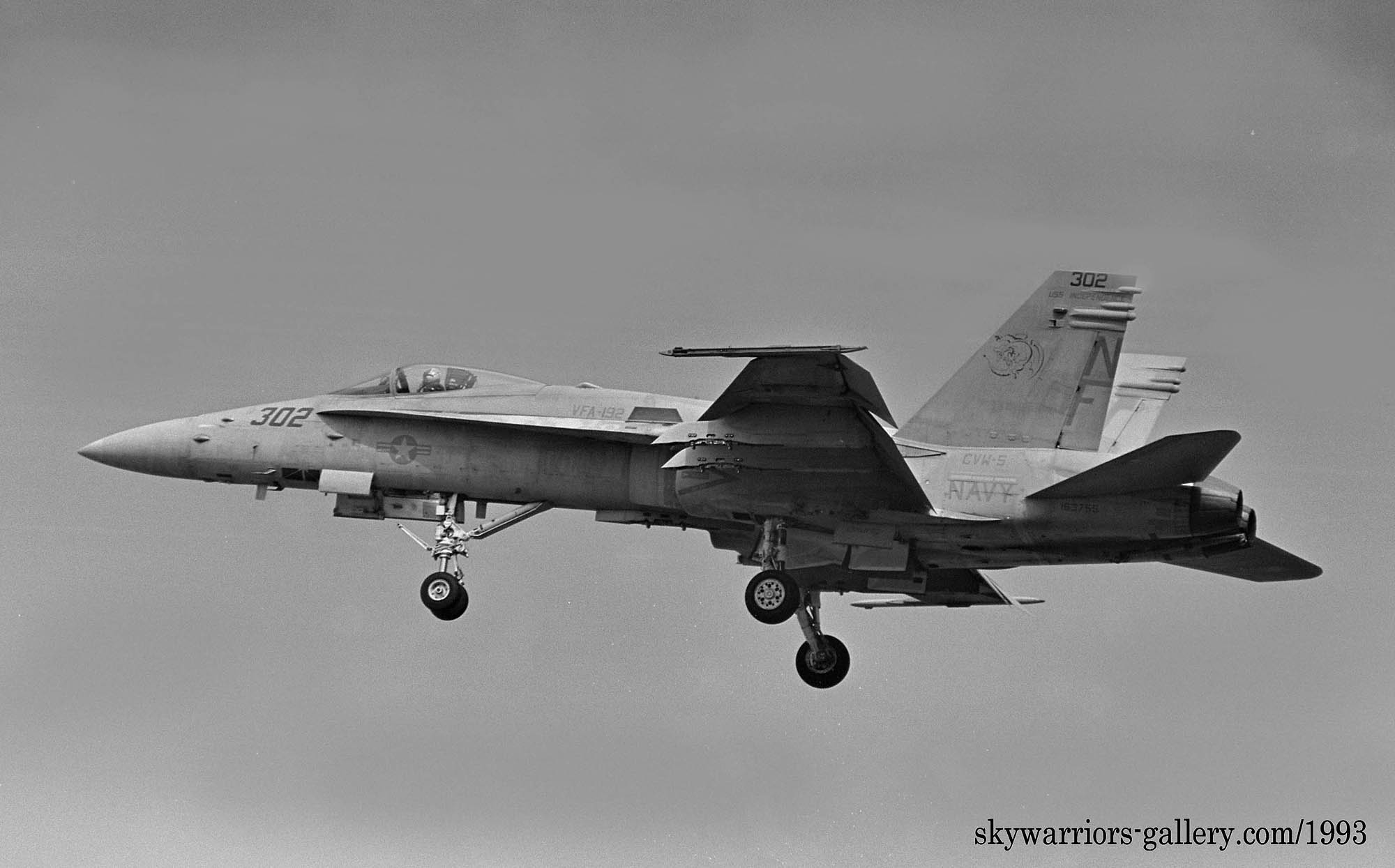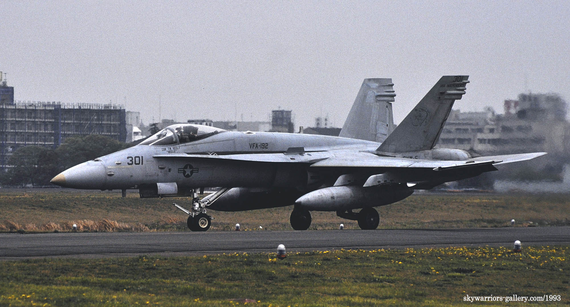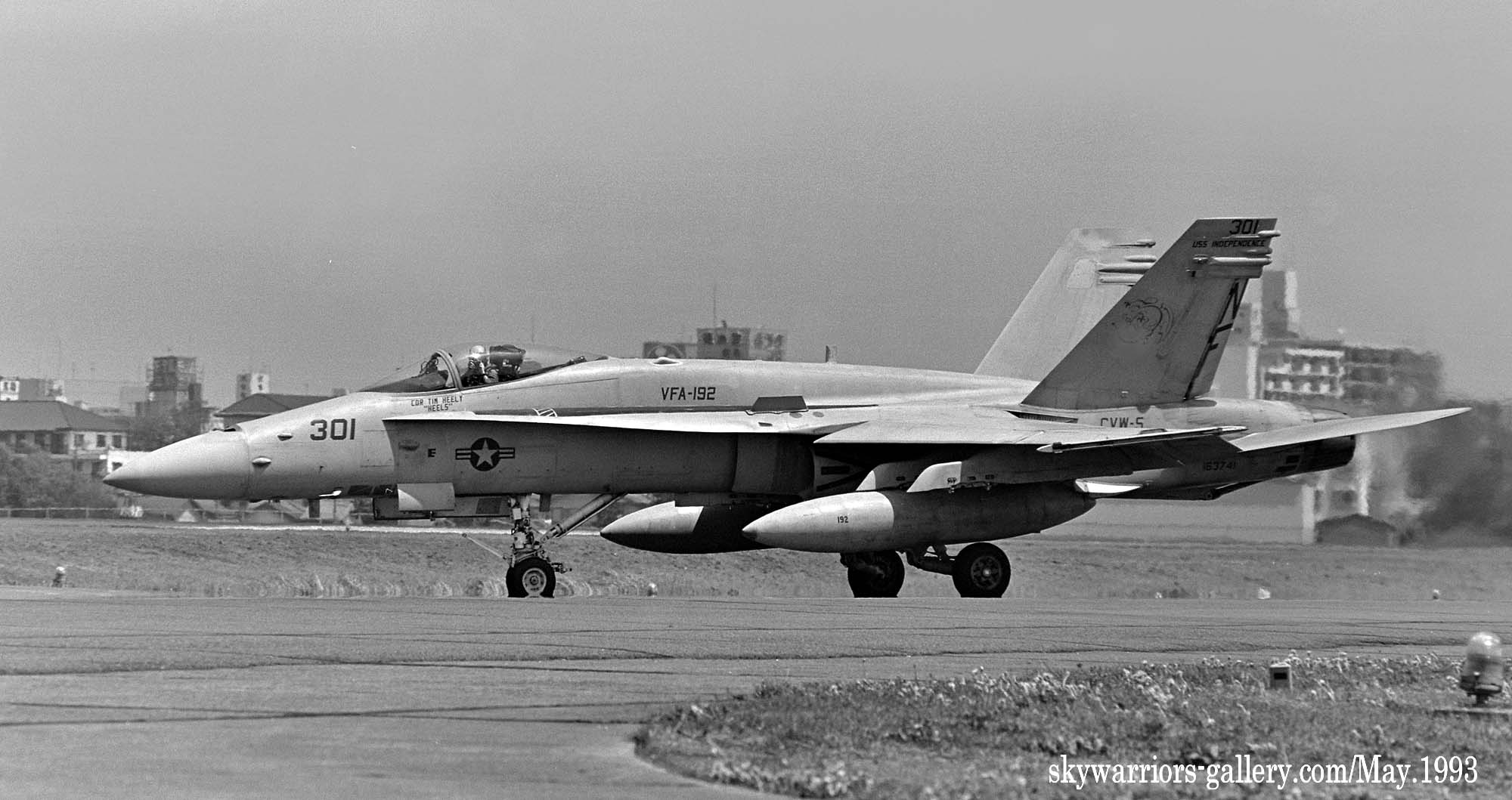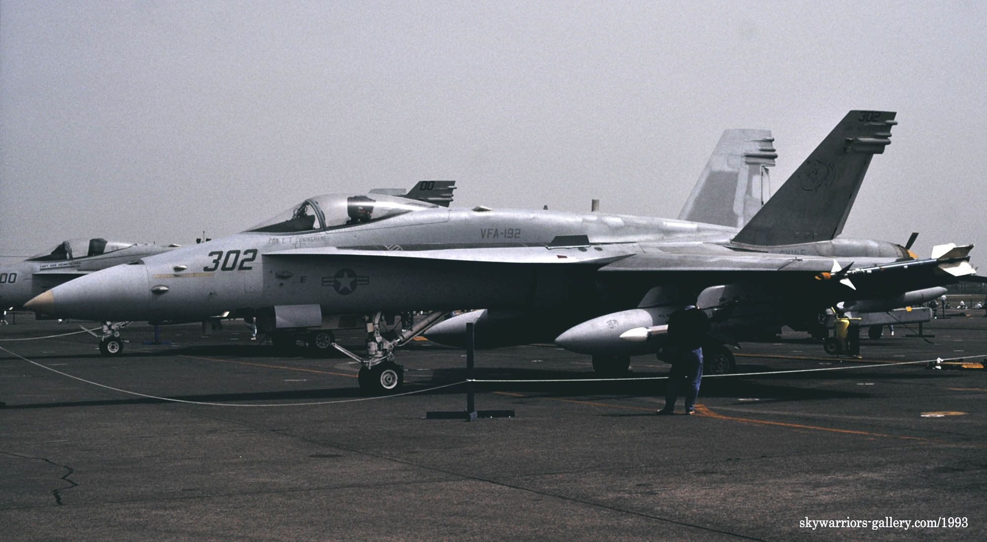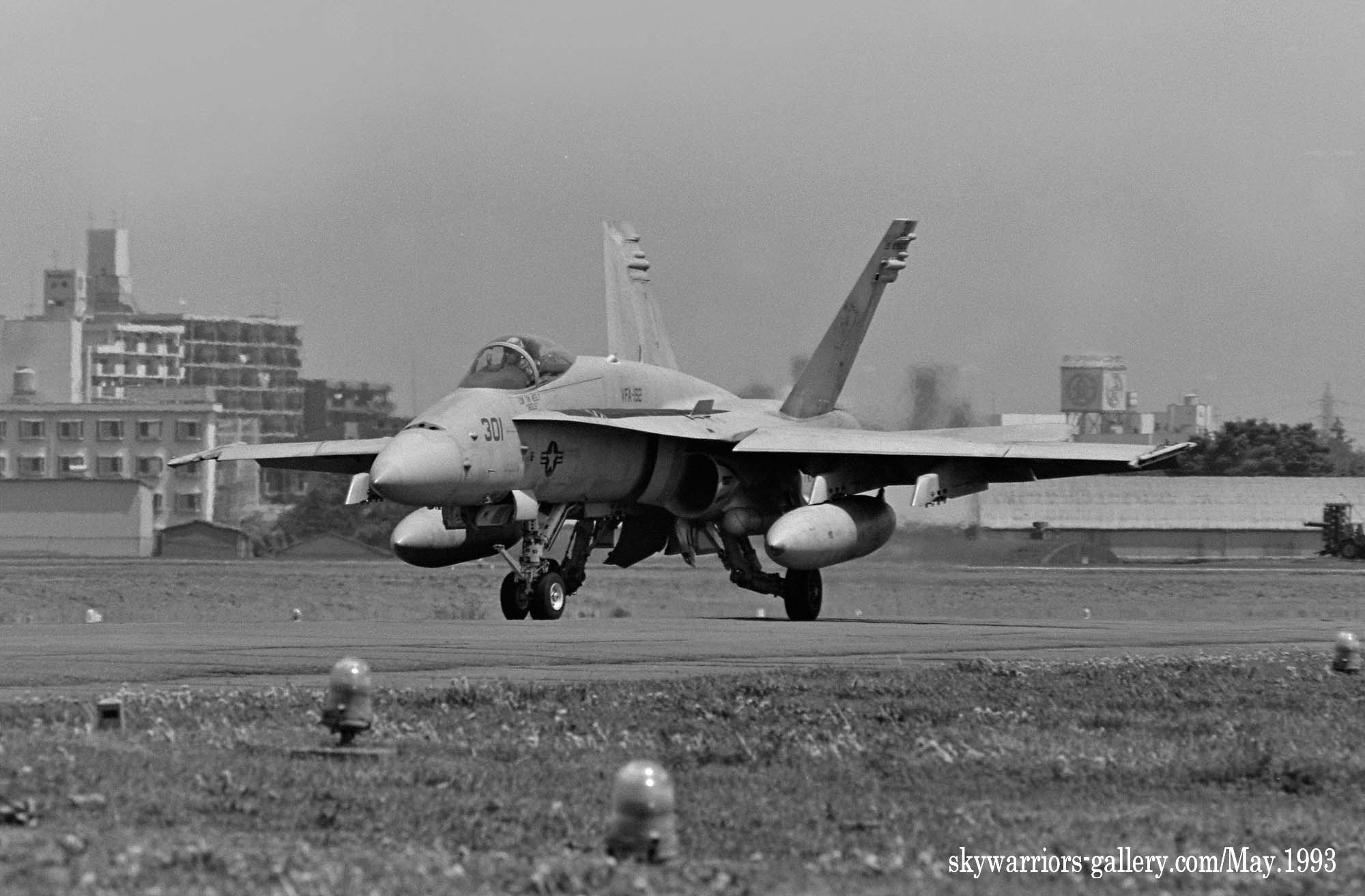 ↑ 1993年5月24日/25日の両日 厚木基地航空際Wing-93が開催された。VFA-192は展示機がNF-302、そして東側エプロンをクロスランウェイして西側誘導路から展示飛行に向かったのはNF-301だった。