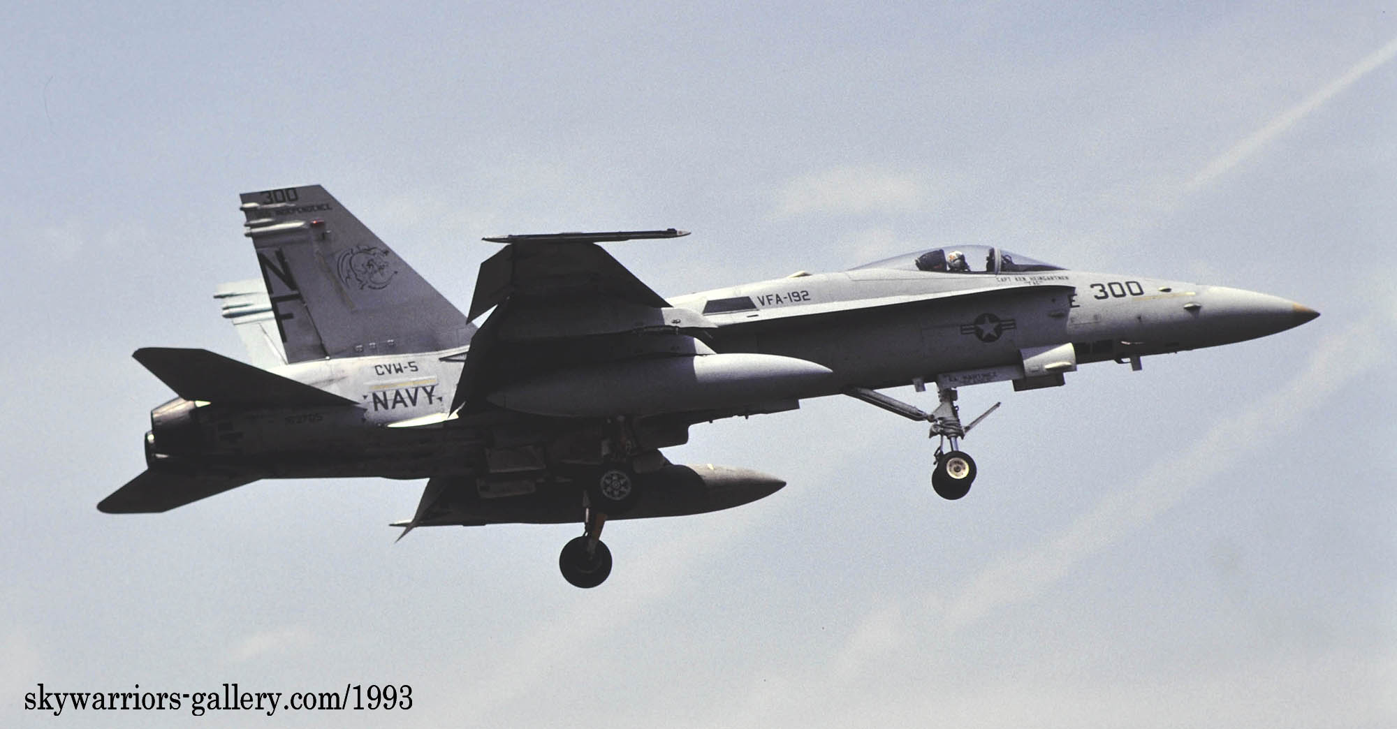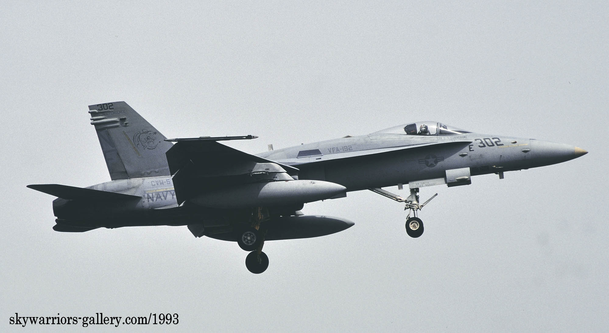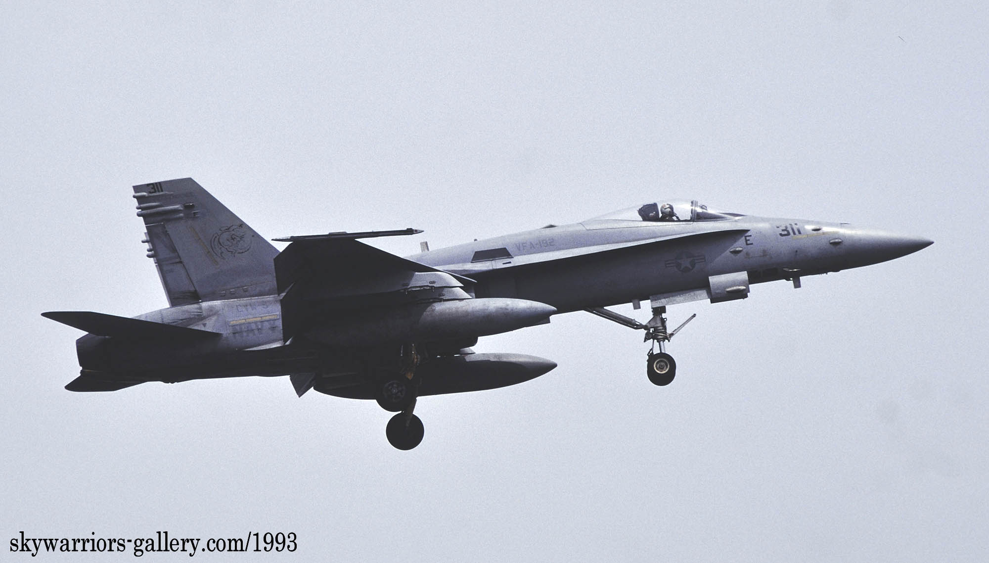 ↑ 1991年までのマーキングと異なるのは、インシグニア等が薄くなっただけではなく、何と入れたばかりのフォールス・キャノピーを消してしまった事。つまり視界範囲での接近戦を想定した疑似コクピットはあまり意味が無いと判断されてきたのか・・・・翌1994年には年姉妹飛行隊VFA-195もフォールス・キャノピーを消すことになる。レーダーの性能が上がり、中距離ミサイルAMRAAMを使いことが多くなれば、視界外での空戦が主になるからかもしれない。