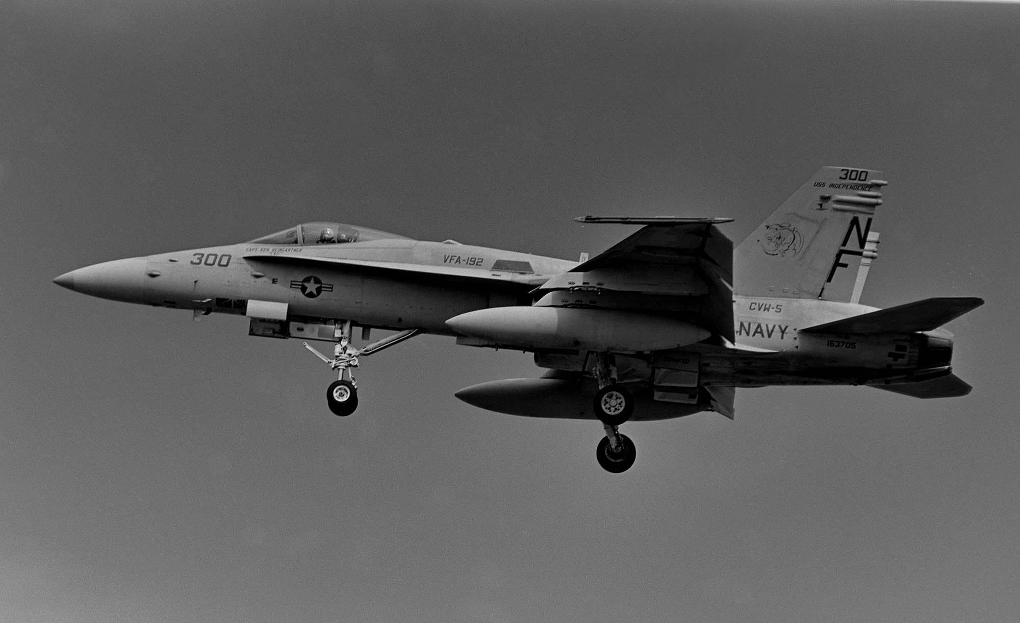 ↑ VFA-192ゴールデンドラゴンズのFA-18C/NF-300/Bu.No.163705。CAG機と他の機体とのマーキングの違いはない。姉妹飛行隊VFA-195ダムバスターズとの違いは、VFA-195が尾翼に”VFA-195”と入れているのに対し、VFA-192は、”NAVY"の上に”CVW-5”と全機に記入していたこと。