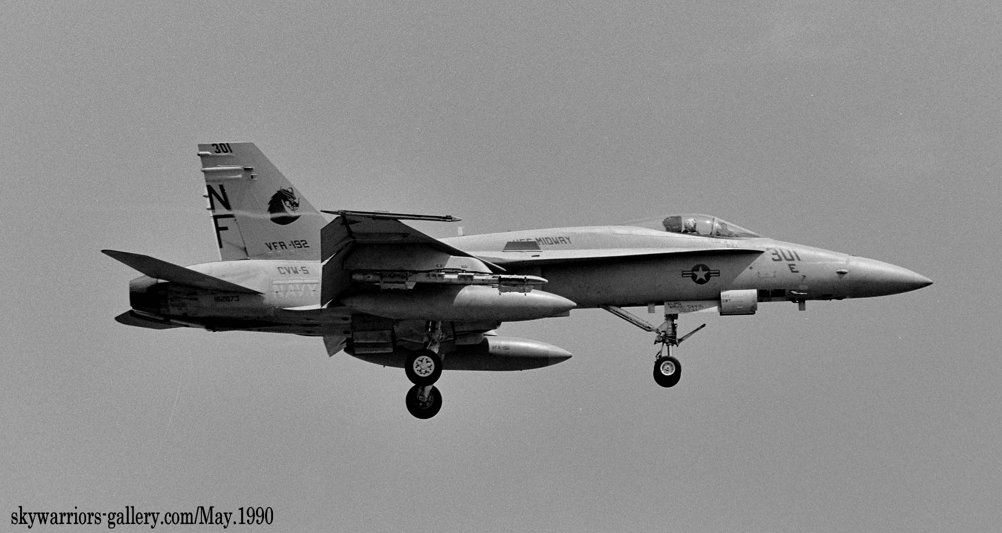 ↑ USSミッドウェイに配備されて間もないVFA-192は1988年の厚木基地公開日、遠方であったが列線を見る事が出来た。 NF-300.ドラゴンが暗いグレーで書き込まれ 胴体に”USS MIDWAY”の文字、もちろん配備当時はA型である。VFA-195と異なりテールレターは、最初からラダーに”NF”と描かれていた。