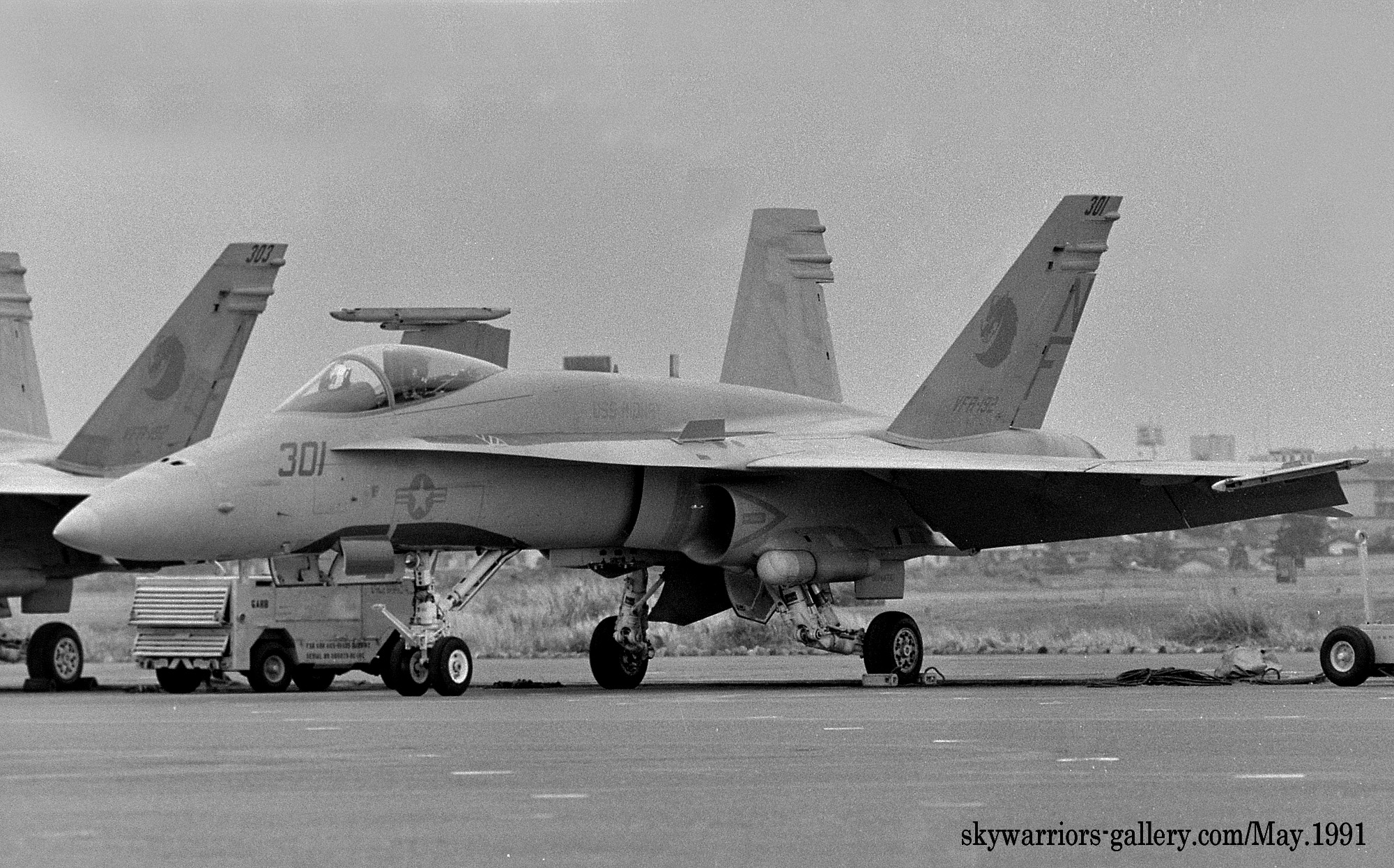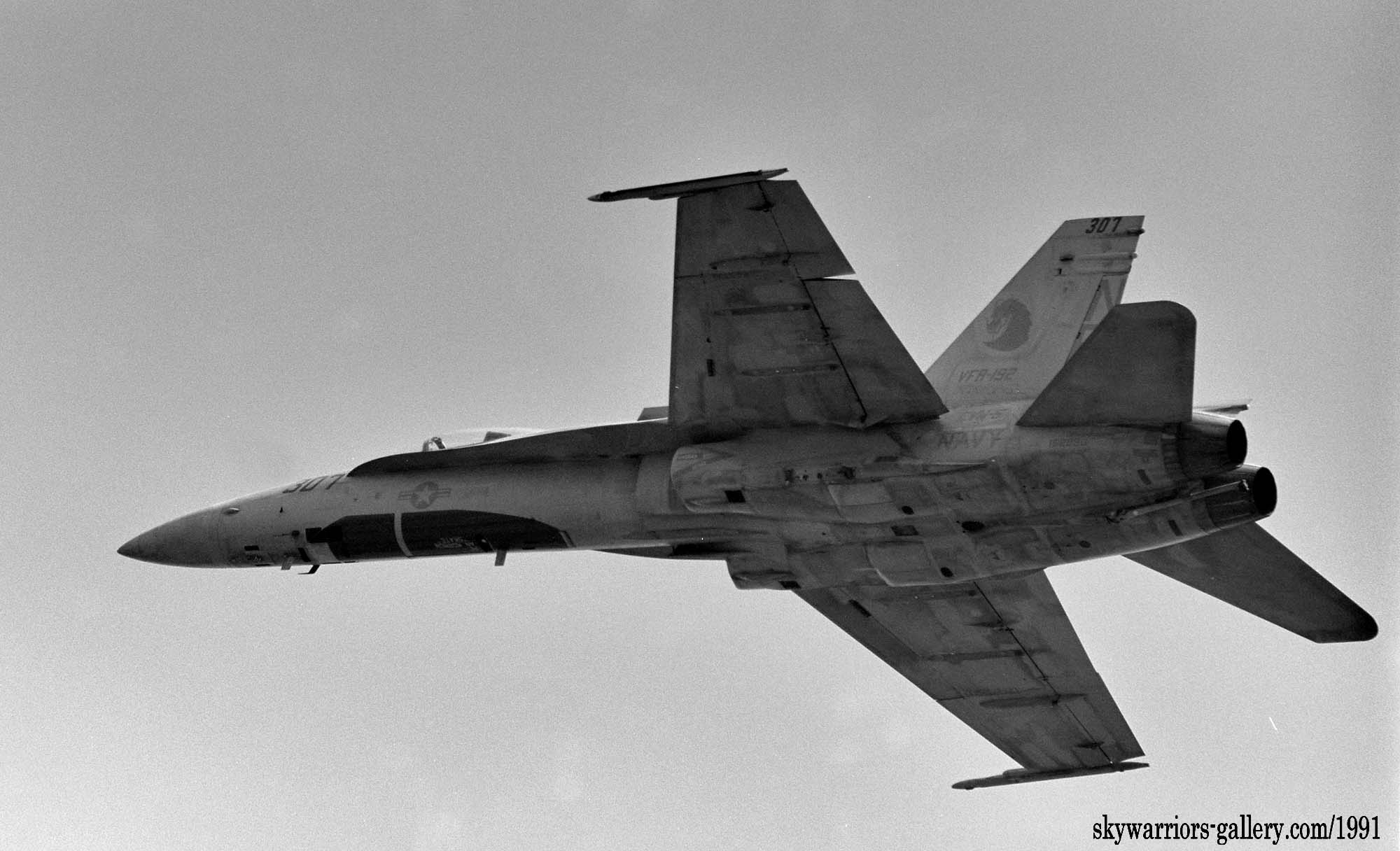 ↑ 1991年VFA-192FA-18A/NF-301/ 。この年彼らのマーキングは多少変更が加えられた。疑似コクピット(フォールス・キャノピ)を色濃く描くことで、DACT(異機種空戦)に於いて,自機の姿勢を敵機に判断しづらくしている。その代り、他のマーキングは薄いグレーに変更され、疑似コクピットの効果を最大限引き出す策がとられた。
