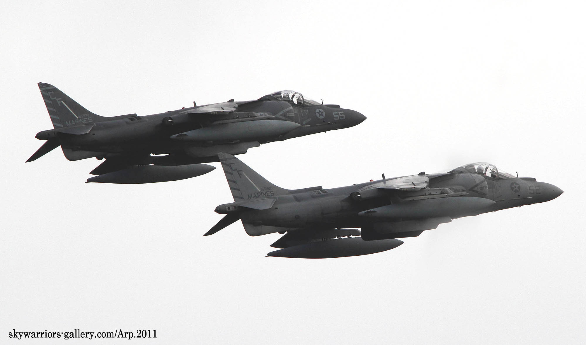 ↑ 2010年ハリアーになって初めて尾翼一面を派手に塗りあげた機体で、アメリカ本国のショーでデビューしたが残念ながらこのマーキングで日本に飛来したことはない。歴代のVMA-211ショーバード機でもっとも目立つマーキングで、機首Modex01は黄色のシャドーが太めに書かれている。尾翼の赤/黄はインシグニアの2色から選ばれたものである。AV-8B Bu.No.165568