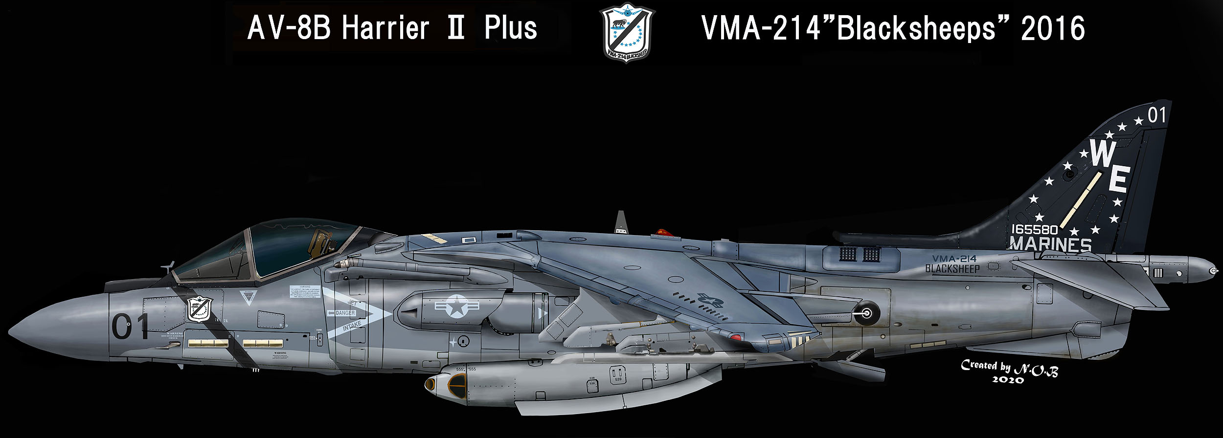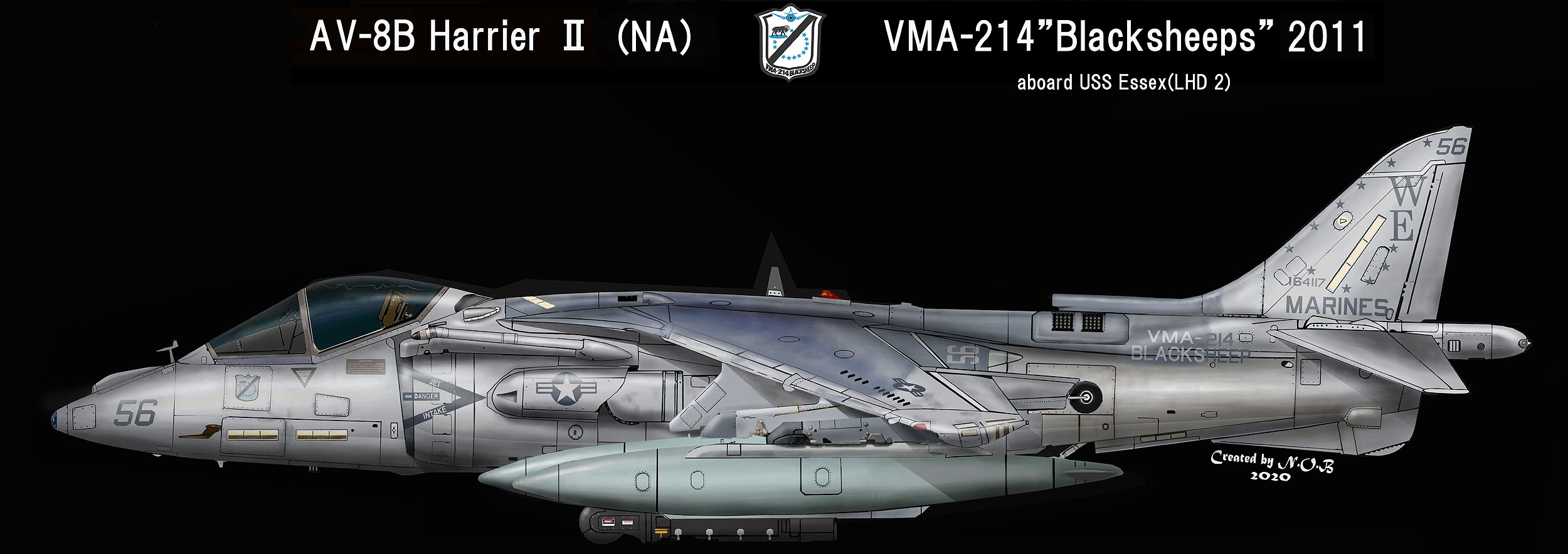 ↑ 上の図と同じ2011年当時のVMA-221所属機の一般的マーキング例。「WE」のテールレターの字体はセンチュリー、その他の文字はゴシック体である。この年強襲揚陸艦USSボクサーに載っていたため 機番は50番台をつけている。尾翼には、12個の★ 、以前は、VMA-311でブラックテール機だった有名な機体イラストでは4本タンクにAN/AAQ-28 LITENING PODを付けてみた。。AV-8B