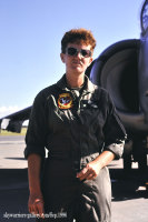 撮影2日目の午前中ランディングを狙って嘉手納のR/W23Rのポイントにi居た時だ。AV-8Bハリアー2機が着陸態勢に入ろうとしていた。私は300mmレンズを構え、県道工事の過程で作られて既に使われなくなったバイパス橋の頂上付近に立って着陸を狙った。ところが橋の下の方から「きゃー!!きゃー!!」とアイドルを発見した追っかけギャルのような声が・・「何だ??いったい」目をやると若い娘が2人金切り声を上げながらバイパス橋に走り上がって来る。この私を有名人とでも見間違ったか?と一瞬勘違いなんかしてしまったが、彼女たちも沖縄観光途中で、降りてくるハリアーを見つけ”撮れるんデス”カメラで必死に撮ろうとしていたのである。「そのカメラで撮るの?」とは 流石に気の毒で言えなかった。この時ばかりは私も”親切なオジサン”になりきって、「もう少し前に出て、そうそう、その辺にいればあの飛行機は2機ともこの上を通過するからしっかり撮れるよ~」なんてね。ハリアーは彼女たちの目の前をゆっくり通過して嘉手納基地に降りた。そして2人の娘はすっかり満足した様子で「有難うございました~」と明るく礼を言って去っていった。きっと沖縄のいい思い出になったことだろう・・(ちなみに、この時の私の写真・・・何故かピントも露出もダメでした・・・ブラックテールのショーバードだったのに・・泣・・) ↓