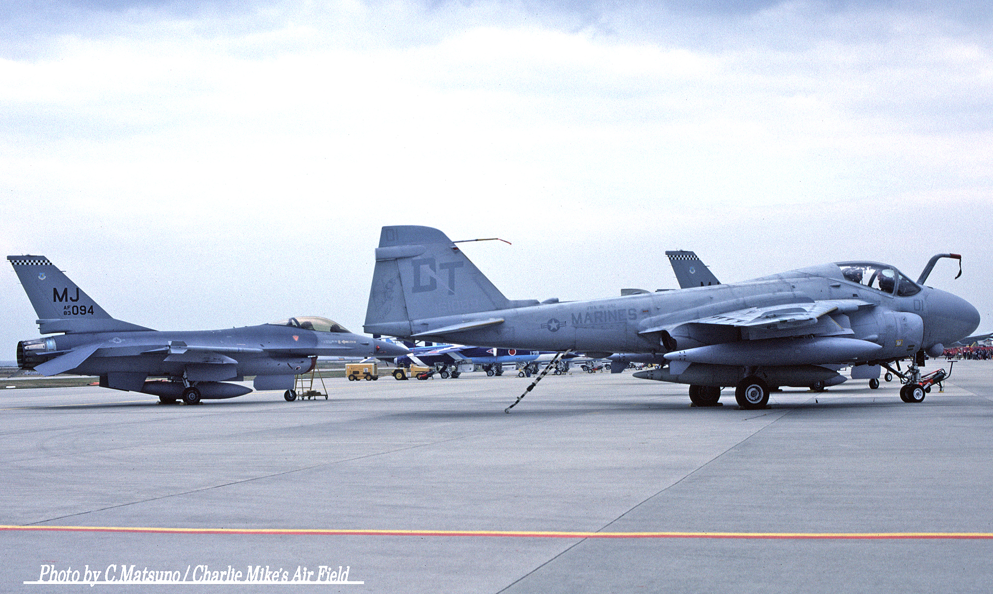 ↑ 松野主税氏が築城基地で撮影されたVMA(AW)-242のA-6E/Bu.No.DT-01/不詳。撮影日も不詳となっているが、奥のF-16A(432nd
