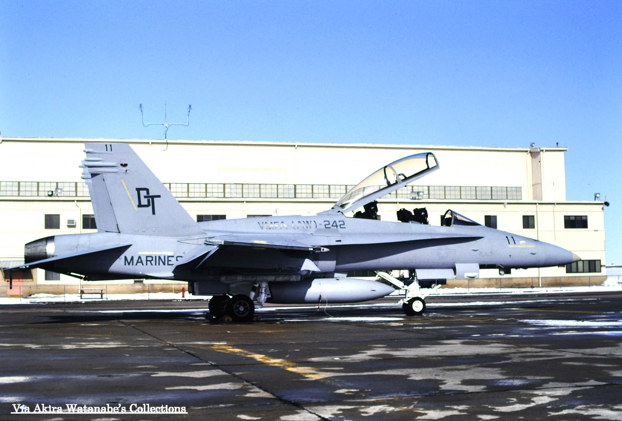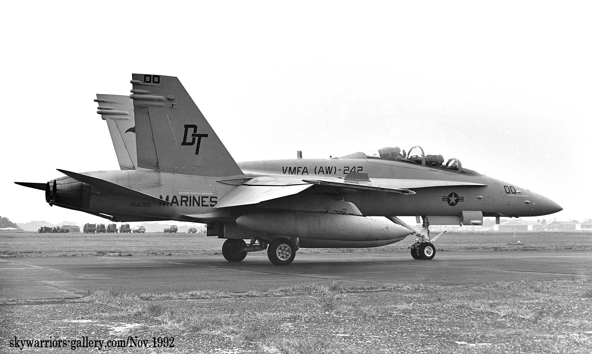 ↑ 1992年1月にアメリカ本国で撮影されたVMFA(AW)-242のFA-18D/DT-11/Bu.No.164263。彼らは1991年2月に部隊として最後のFA-18Dを受領して定数を見たし約1年になろうとしていた。盛んにエルトロ海兵隊基地で海外派遣に備え準備をしていたはずである。日本の岩国基地に配備される直前の写真であり、撮影場所は不明ながら興味深い写真である。