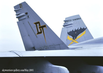 ↑ 2004年9月よりオペレーション・イラク・フリーダムでアル・アサド基地に派遣された際、DT-01は、機体と塗装を変え、上のような黒とグレーだけのシックなマーキングに変わった。オカルト風文字は、前年のマーキングをそのまま踏襲している。F/A-18D Bu.No.165528