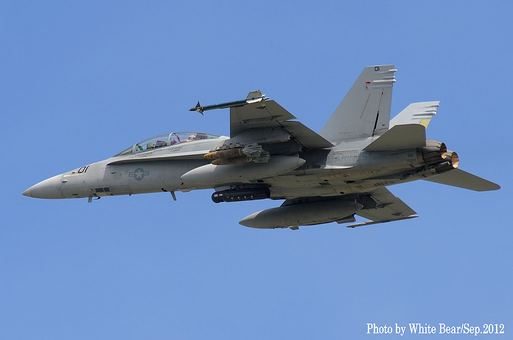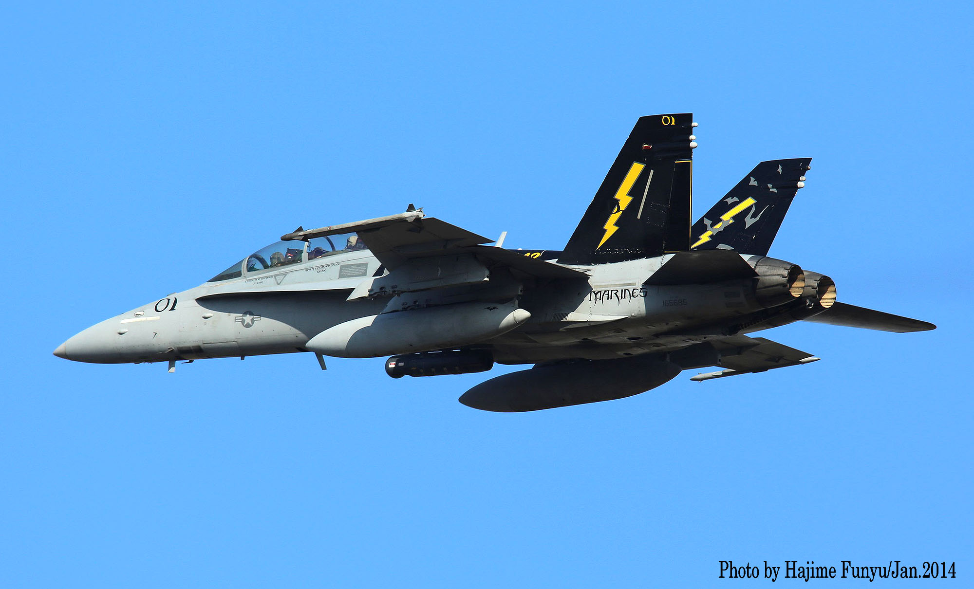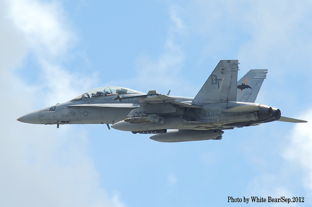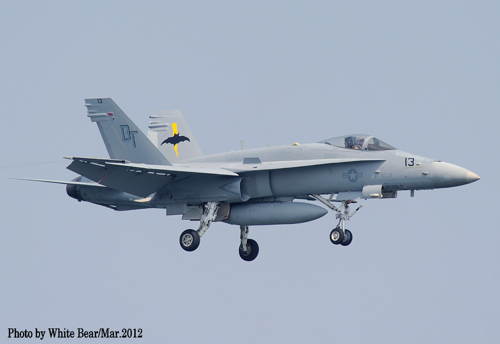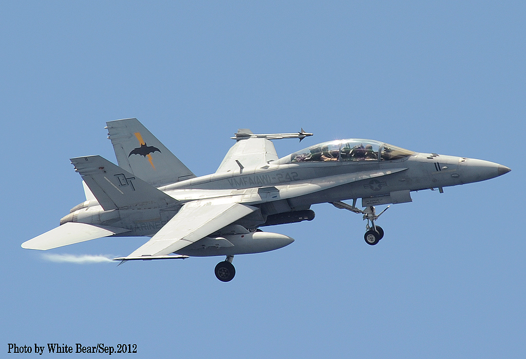 ↑ White Bearさんが、2013年3月嘉手納基地R/W-05で撮影されたVMFA(AW)-242のFA-18D/DT-01。真新しいショーバードの姿である。
