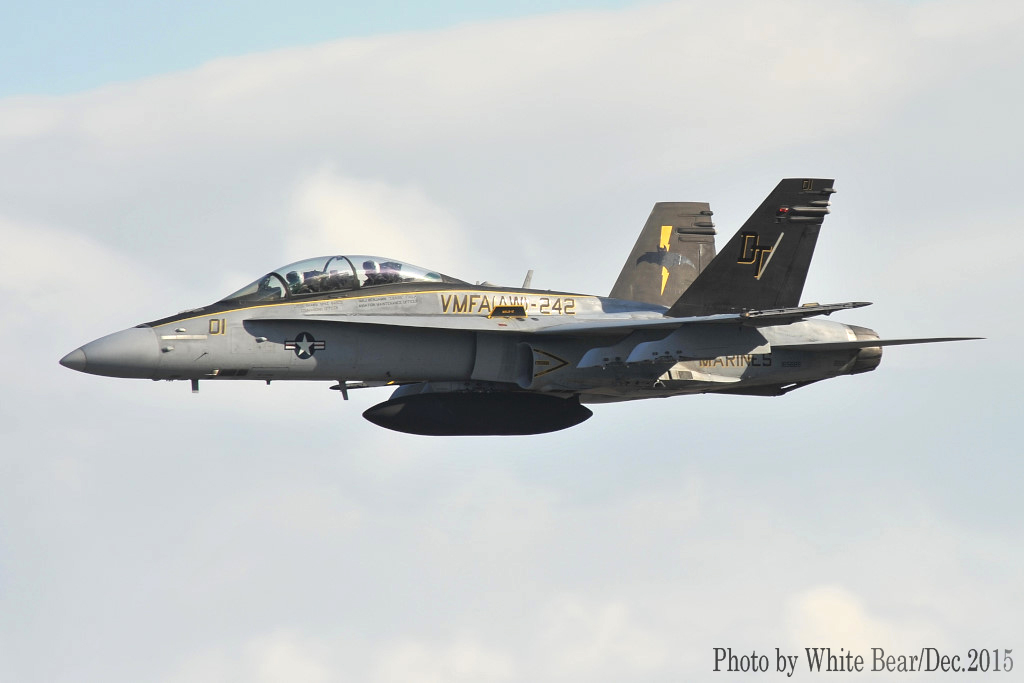 ↑ 2015年12月岩国基地で飛行訓練をするVMFA(AW)-242のFA-18D ブラックテール機。久々にショーバードが胴体に生まれた初期のマーキングに回帰したものであるが、黒色のモヒカンが機首まで伸びたためにより精悍な姿になっている。