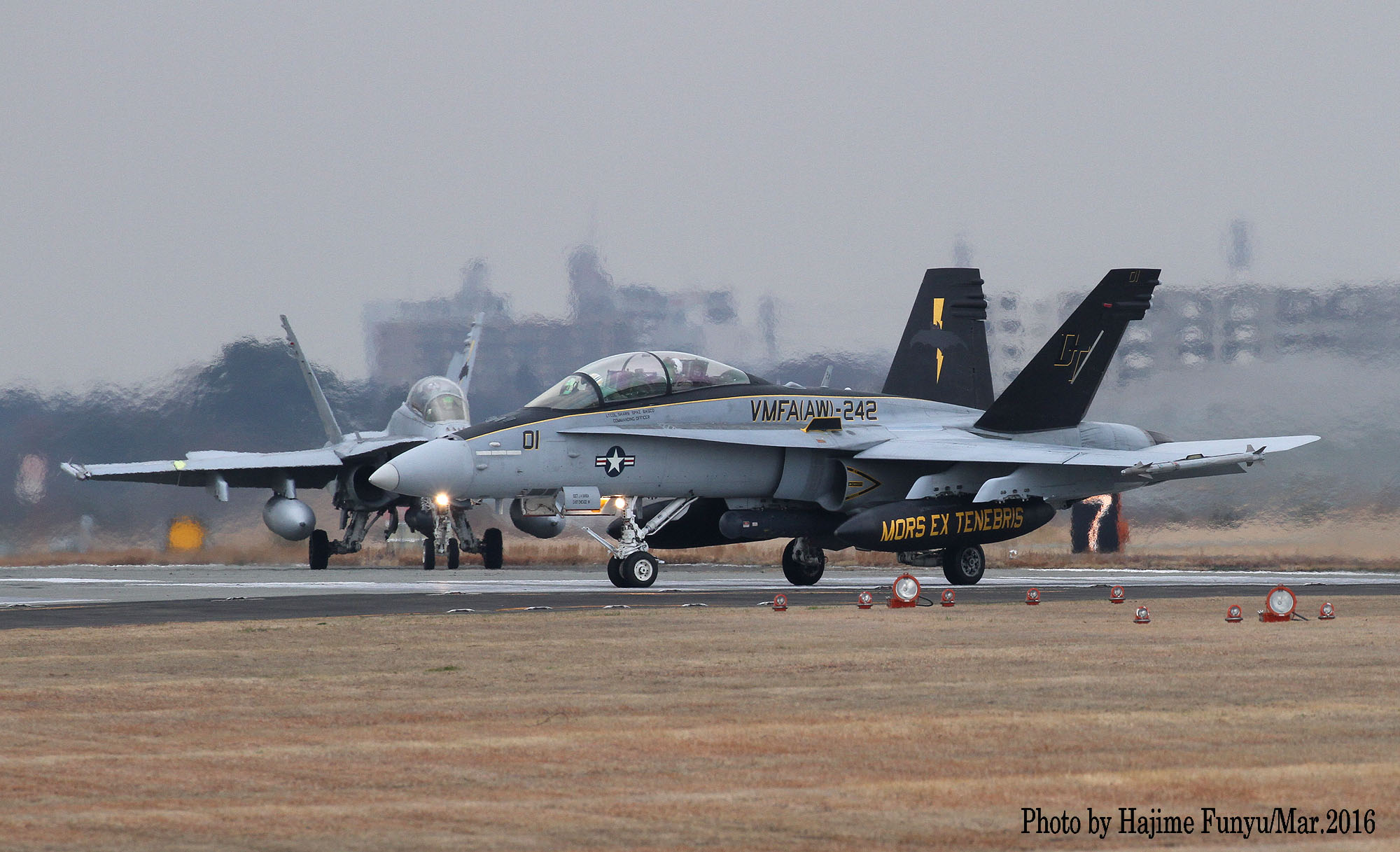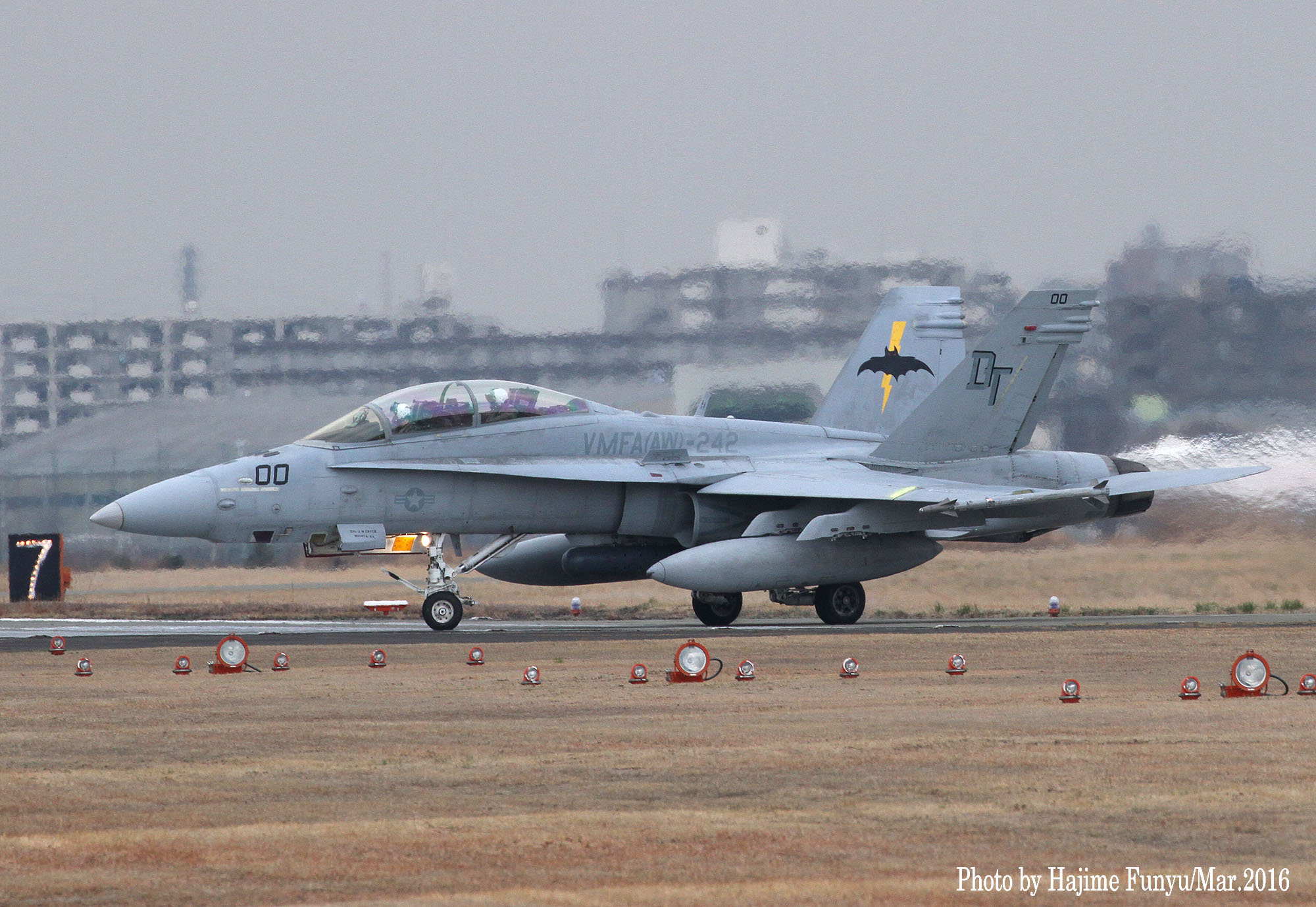 ↑ VMFA(AW)-242 の隊長機新塗装・・昔のデザインの踏襲であるが一番それらしいマーキングに回帰してくれた。”暗黒からの死”のロゴが燃料タンクに移ったのが特徴。作品は全てフニュフニュ君が、2016年3月12日に厚木で撮影したものである。私の好きなタキシング・・・羨ましい限りだ。フニュ君毎回有難うございます。