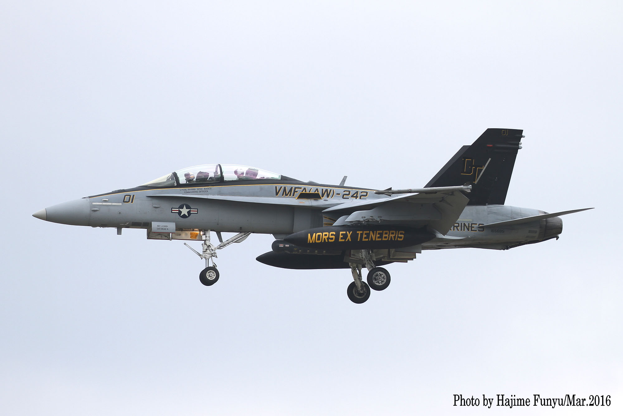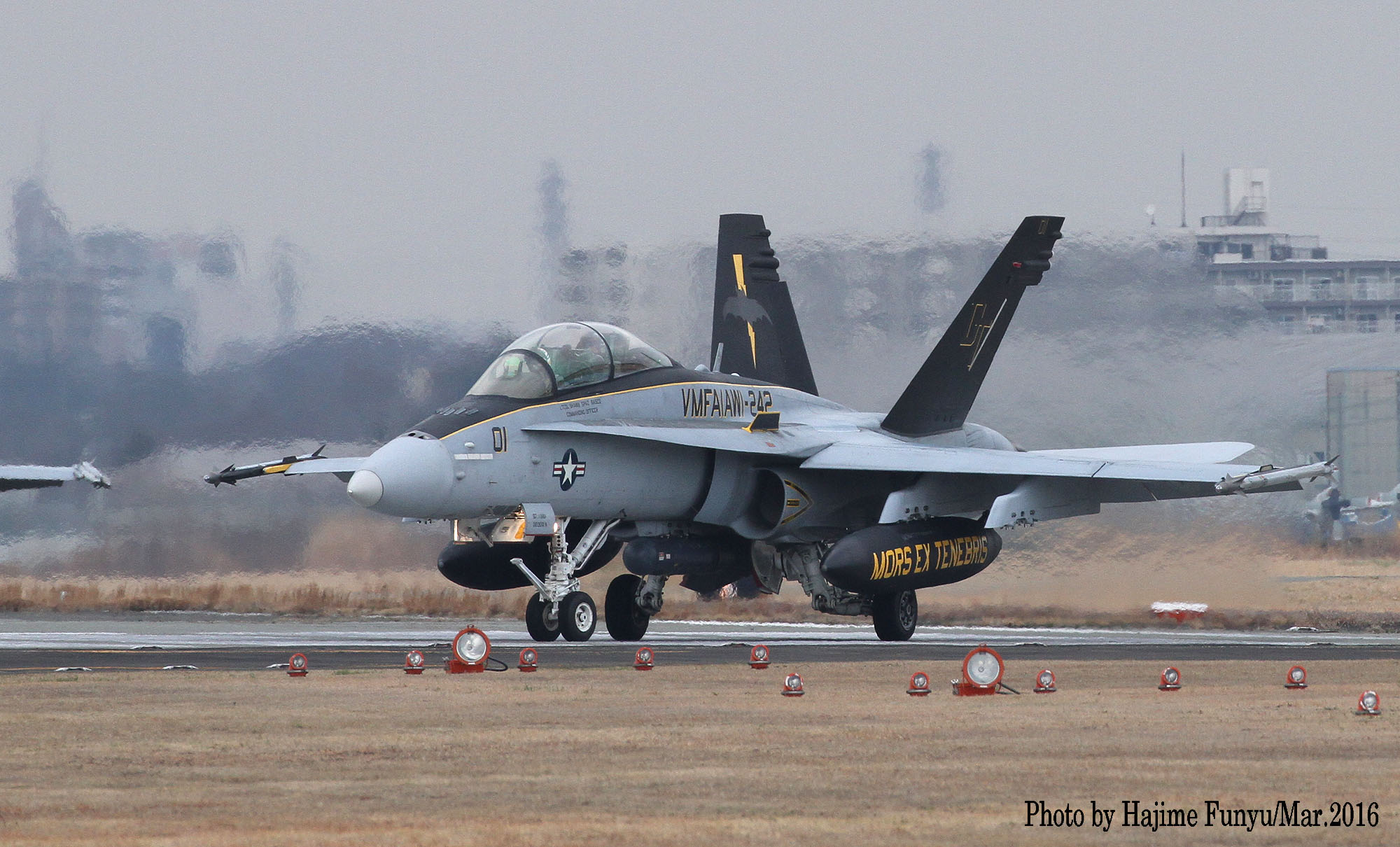 ↑ 2016年3月に厚木基地に訓練で飛来したVMFA(AW)-242のFA-18D ATARSと呼ばれるカメラユニットを付けているが、同隊にはこのタイプが常に3機程存在していたそうである。