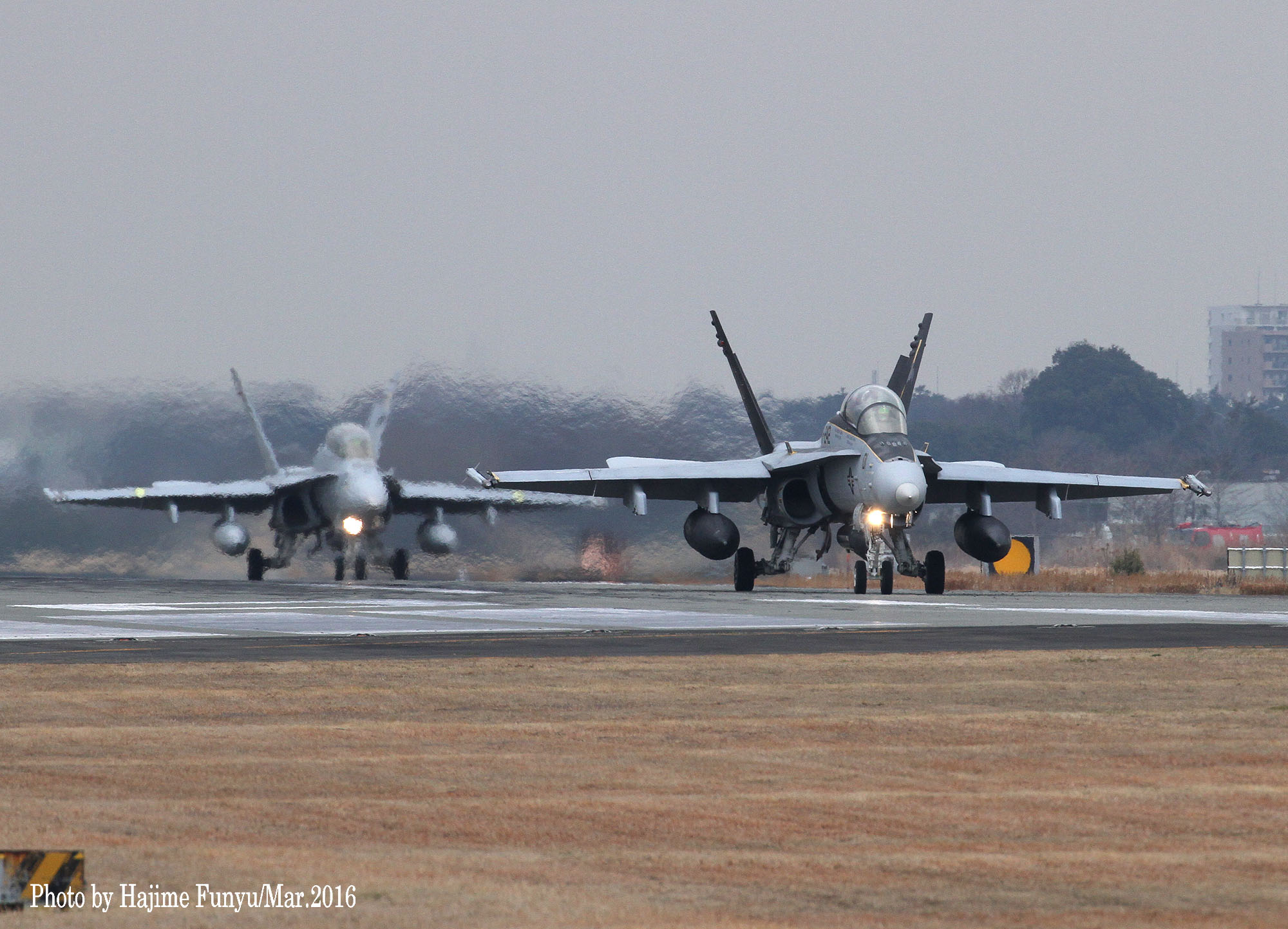 ↑ 厚木に飛来後、ローカルでの訓練飛行を終えて岩国基地に戻る2機のFA-18D。3月のまだ寒そうな曇り空の下、R/W-01に向かう機体後方からエンジン排気が広がり、背景を大きく揺らしている。フニュ師匠の撮影である。