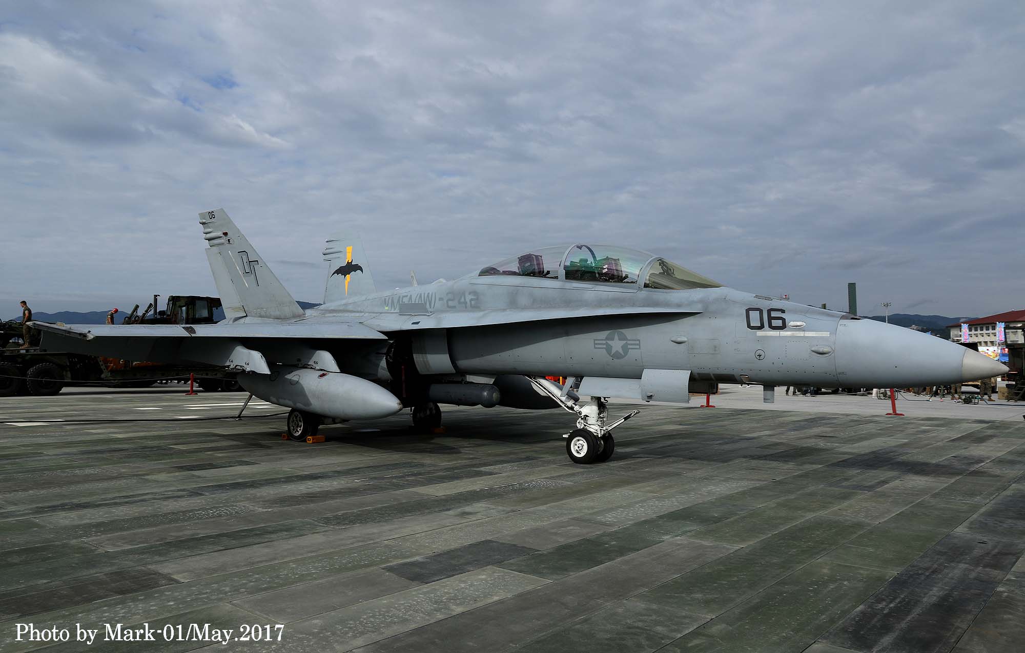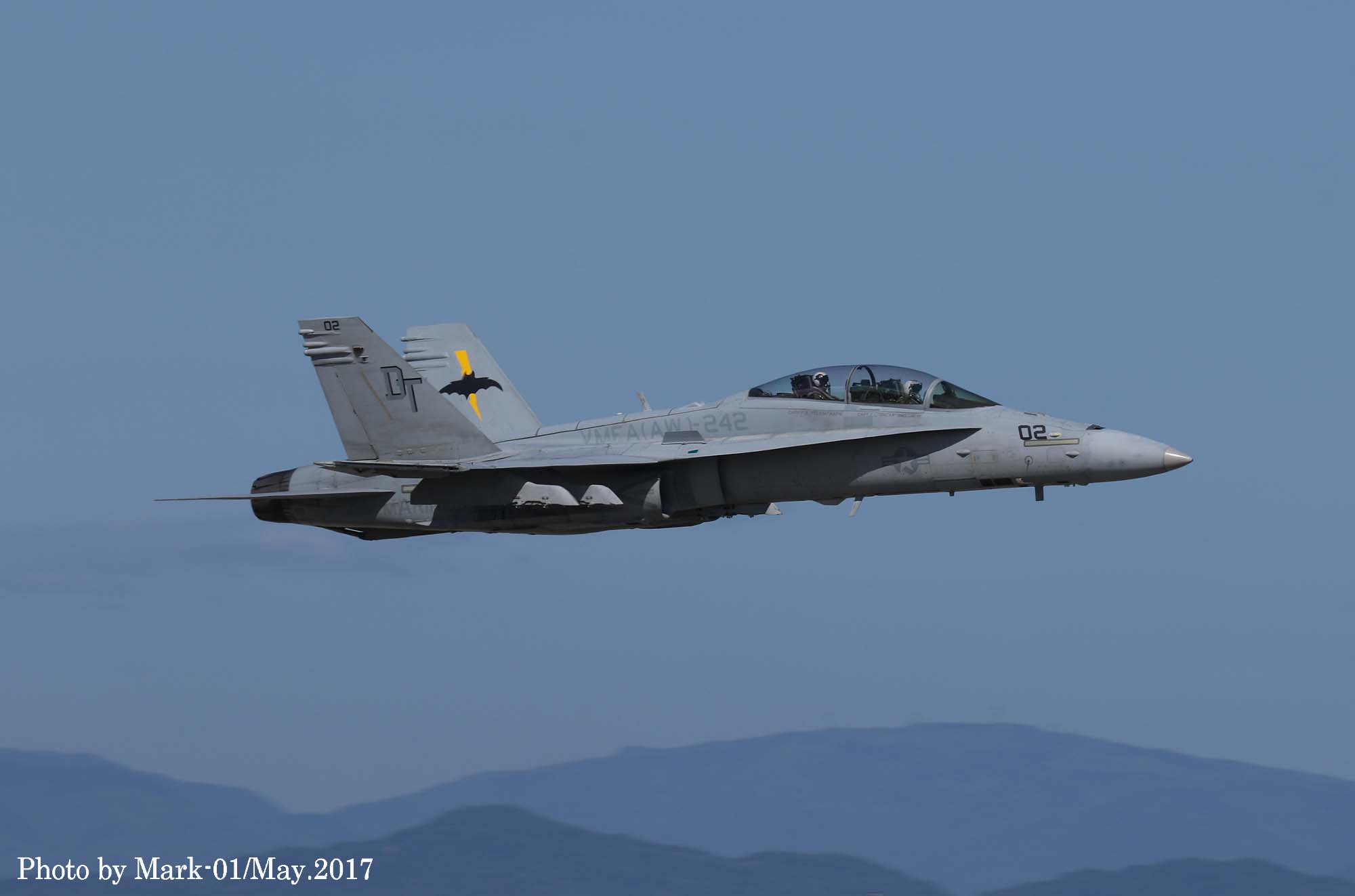 ↑ 2017年5月岩国基地で訓練飛行するFA-18D。この年の1月にVMFA-121のF-35Bが岩国基地に飛来して運用を開始しており、マスコミを始め一般的な関心はそちらの新鋭機の方に集中していたはずである。