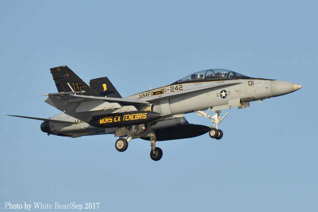 本ページはVMFA(AW)-242の2017年頃の活動から部隊が終焉する2021年までの活動状況を写真と共にご紹介する。同隊は本来の終焉ではなく、ご存知の通り、F-35Bの部隊に転換し”AW"が無くなってVMFAに変わるのである。2008年3月アメリカ西海岸ミラマー海軍基地からVMFA-212の後継長期派遣部隊として岩国海兵隊基地に派遣され、永らく岩国基地に駐留し、最もなじみの深い部隊ともなっていた為、DTテールコードを付けたFA-18Dに別れを惜しむ声は多かった。