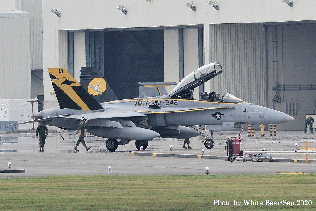 ↑ 2020年9月にWhite Bearさんが岩国基地で撮影された最後のショーバードDT-01。VMFA(AW)-242の歴代のカラーバードの中でも、最も優れたデザインの一つだと私は思うのであるが、皆さんは如何だろうか。