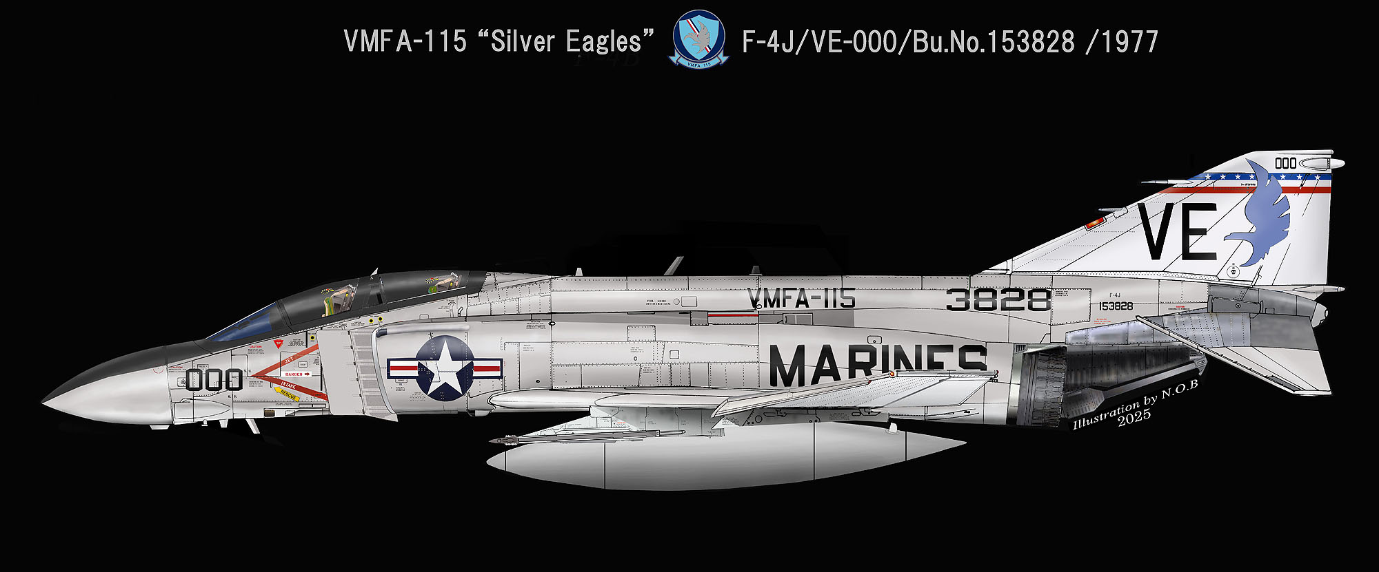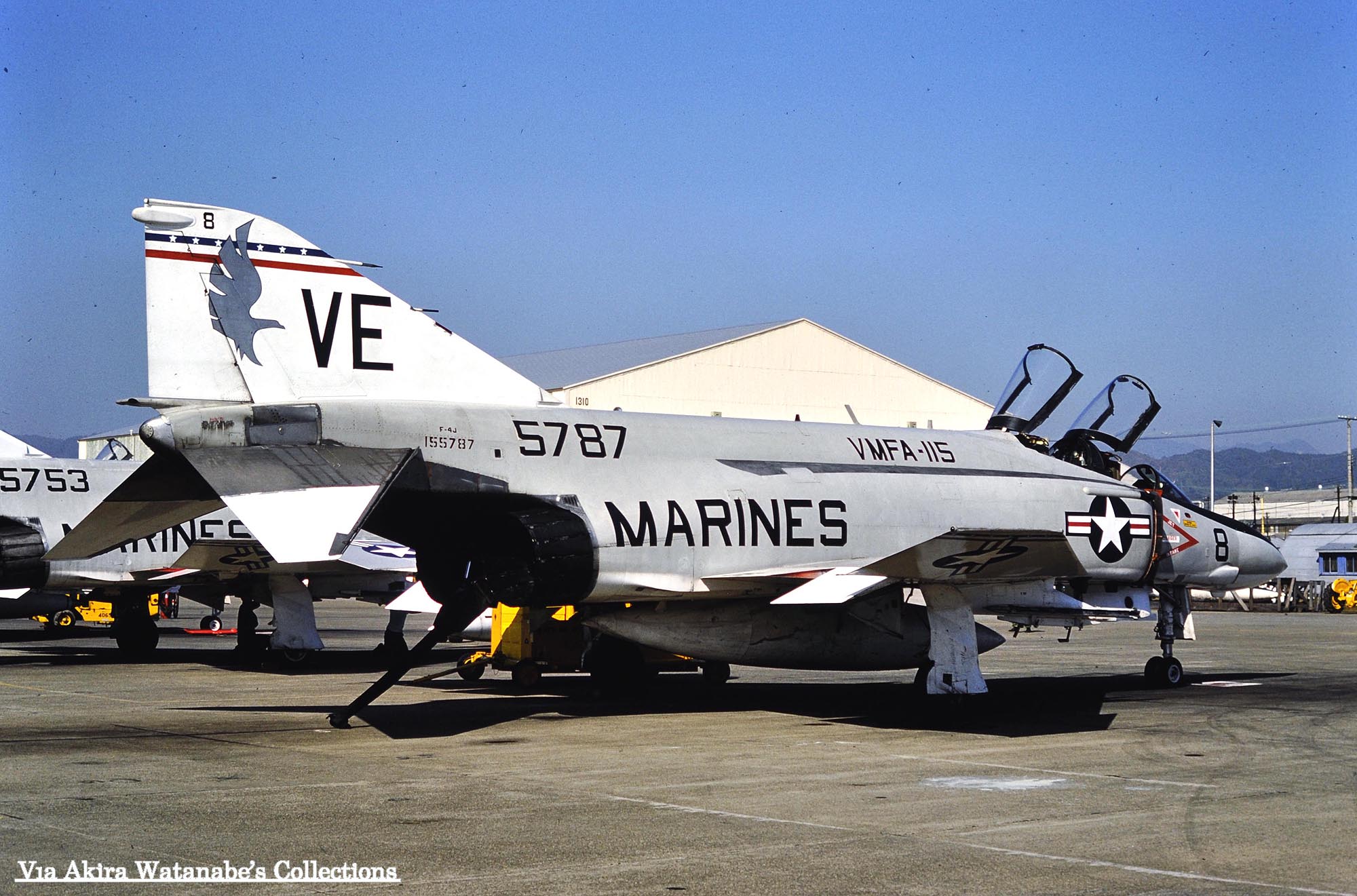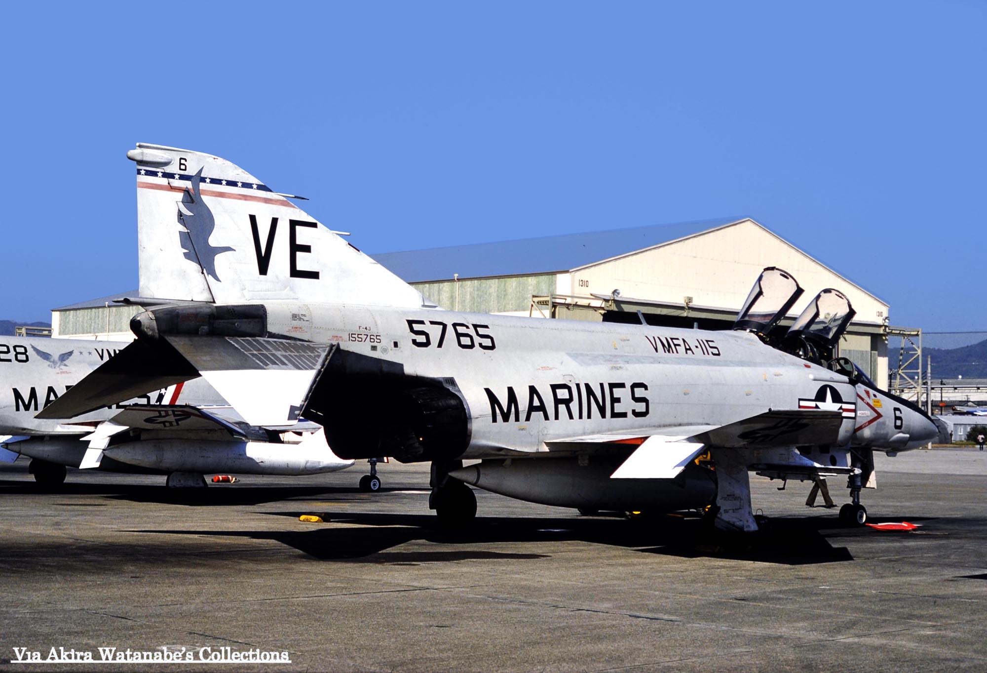 VMFA-115はベトナム戦争の前後も長期にわたり岩国基地に駐留していた為、同隊がF-4ファントムを使っていた時期は、日本の軍用機マニアには最もなじみ深い部隊の一つであった。私個人的にはこの部隊との縁が薄かったのか、撮影の機会にはあまり恵まれなかったが、シンプルで美しいマーキングは常に海軍/海兵隊航空マニアの憧れの的であった。以下はVMFA-115のF-4J時代の思い出話である。