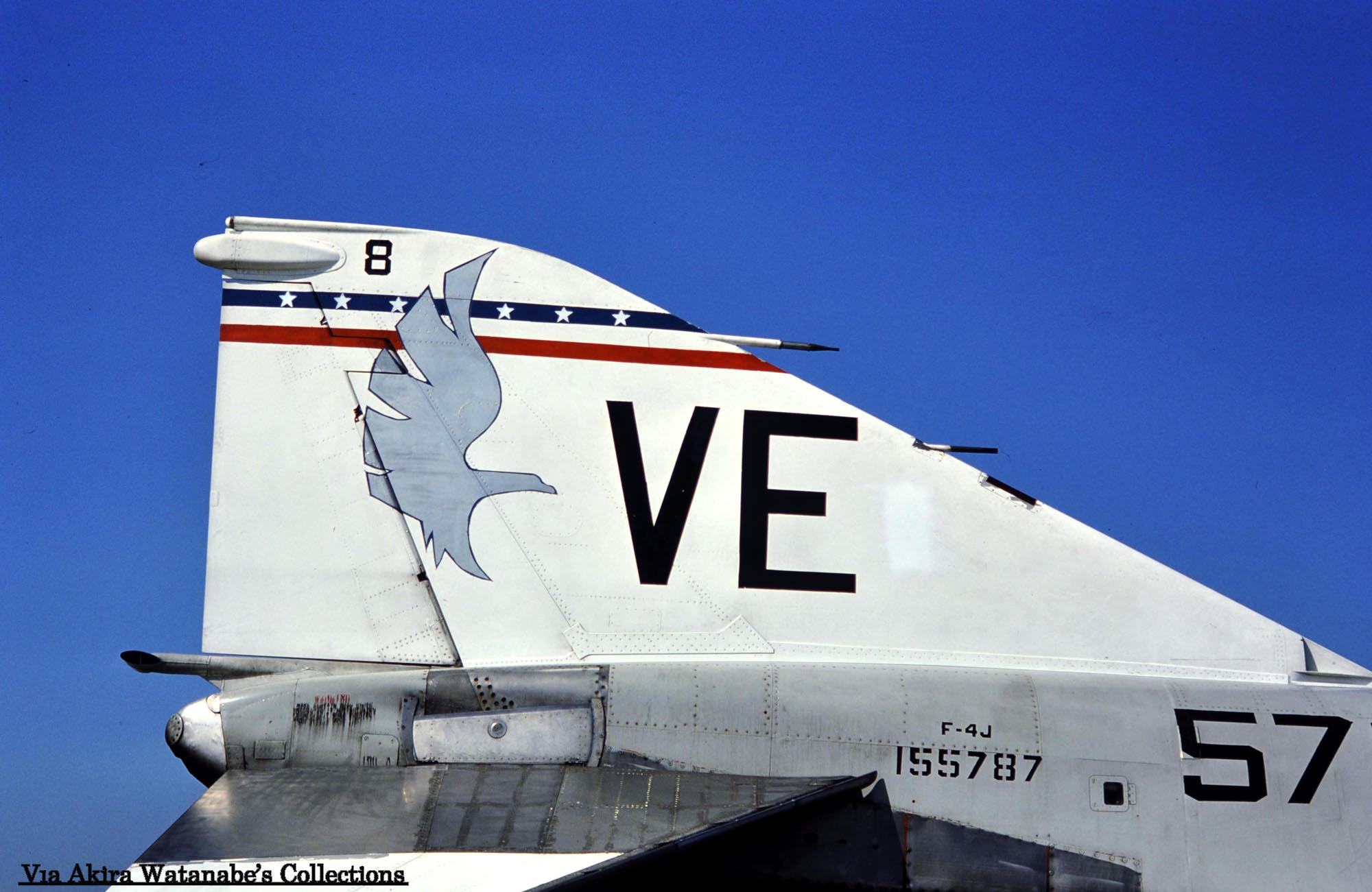 ↑銀鷲の尾翼のマーキングであるが、F-4B時代と上写真のF-4J時代では小さなデザインの変更があるが、お分かりだろうか?・・・そうJ型は尾翼のトリトコールの青のラインに7つの星が加わっているのである。