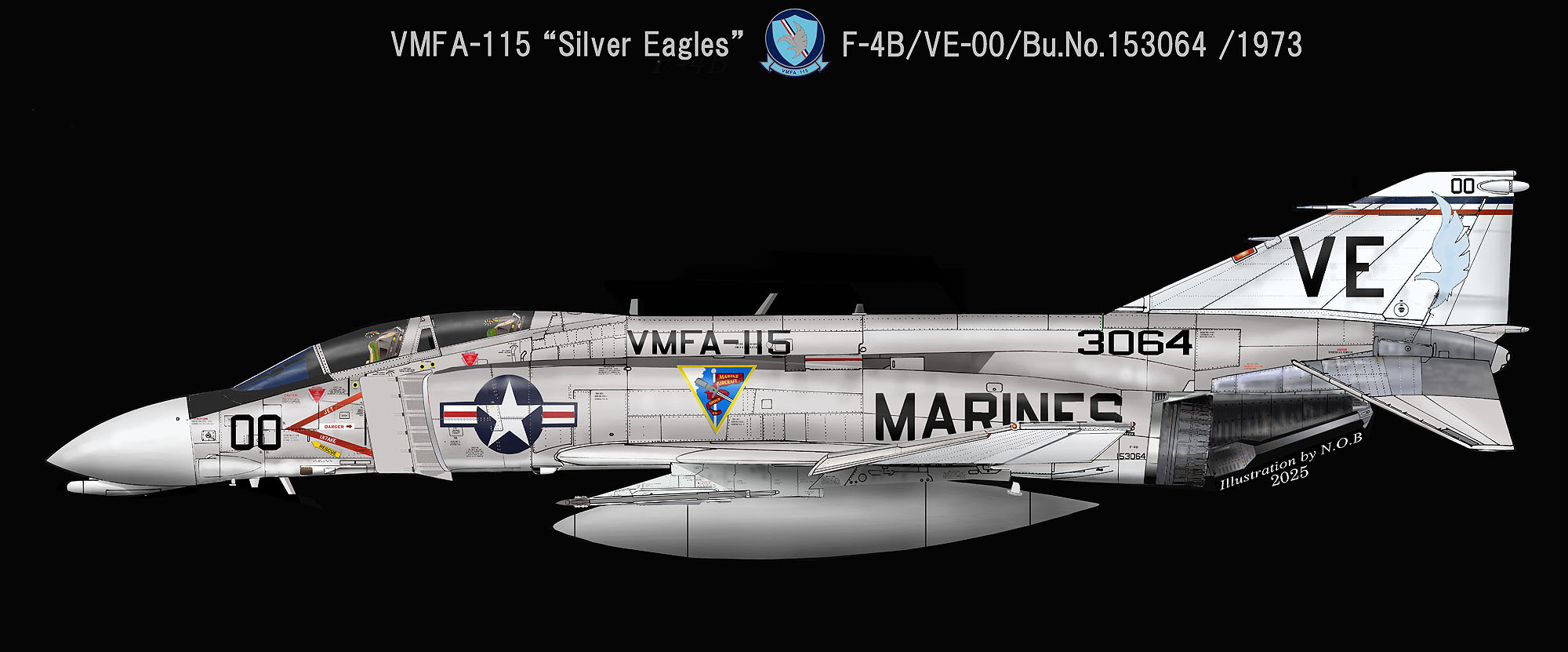 ↑ VMFA-115の司令官指定機VE-00。F-4B時代の塗装で一時期胴体中央部に大きなMAG-15 (海兵第15航空団)のインシグニアを入れていた。時期が異なって ”Joker”と言うニックネームを書き込んでいた姿もあったようだ。F-4B/VE-00/Bu.No.153064