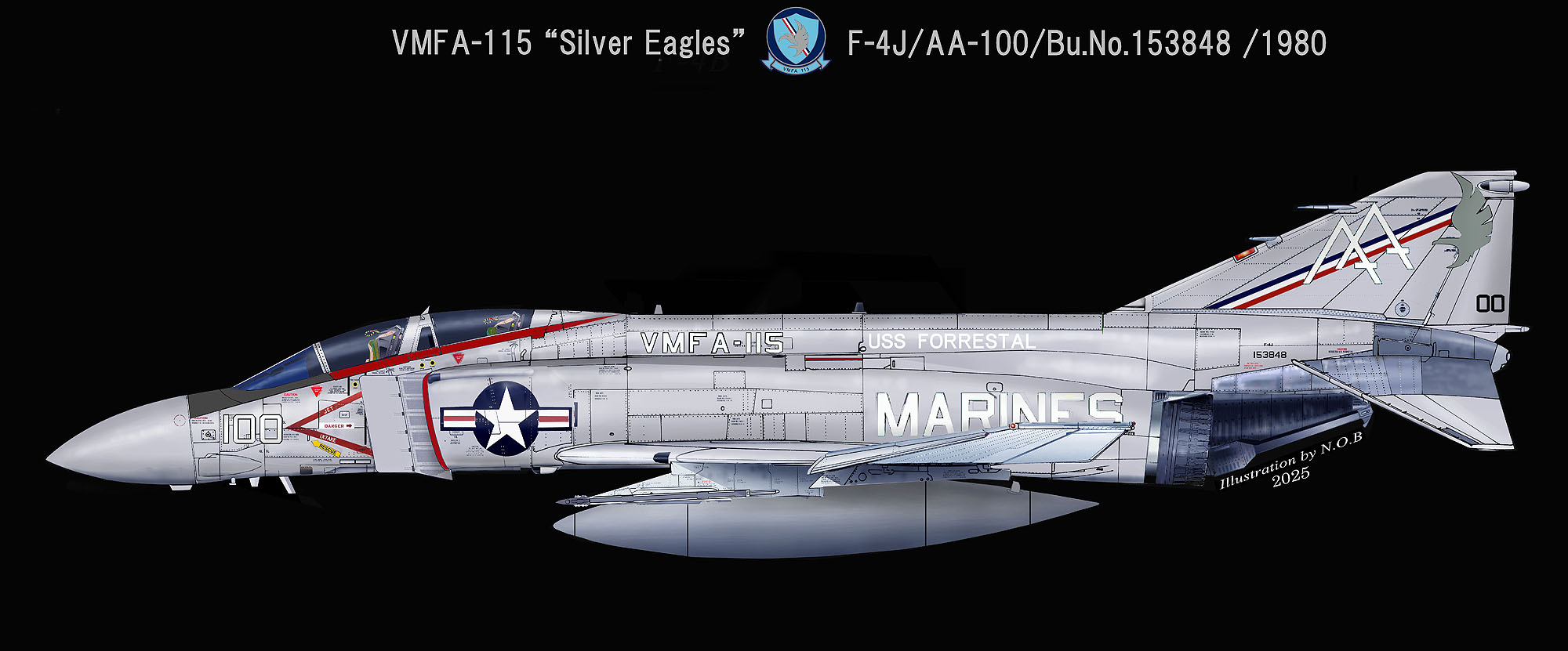 ↑ 1978年ロービジ化されたVMFA-115の新マーキング。尾翼のイーグルのデザインは大幅に変更されていた。文字類は全て黒枠付の白色で統一された。F-4J/VE-14/Bu.No.155830