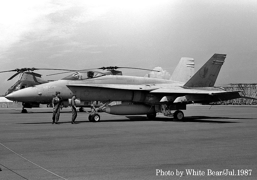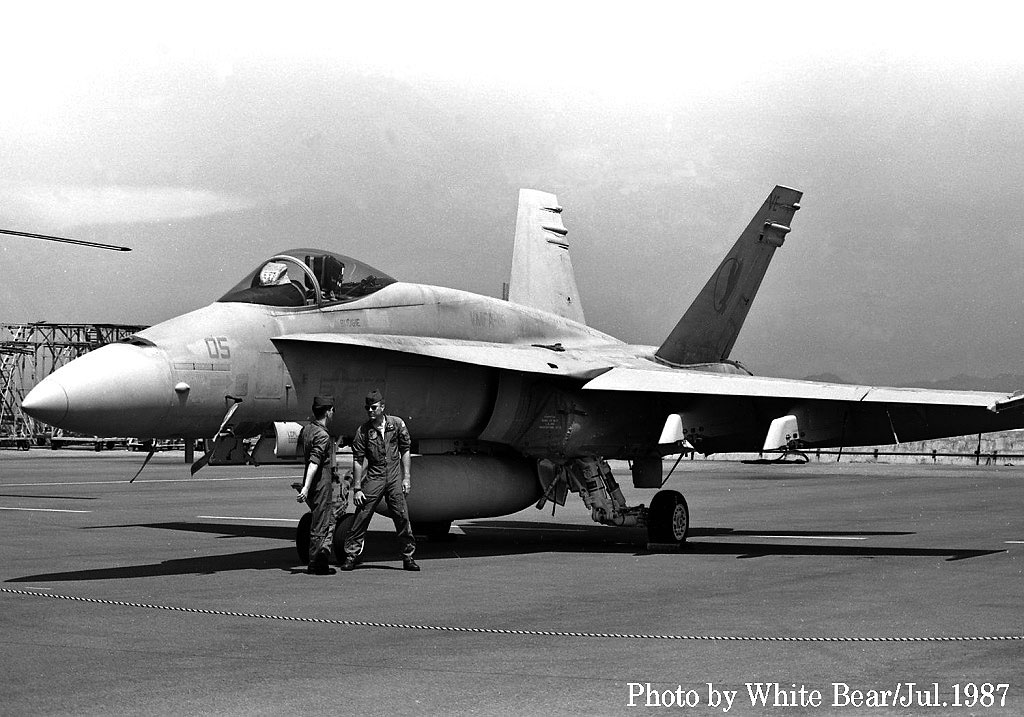 ↑ 上の3枚の写真は何れも1987年11月に撮影されたもので、背景から岩国基地ではないかと推測する。同隊は1987年7月頃、FA-18Aの最初の派遣部隊として岩国基地に到着しており、当時は12機編成での派遣部隊となっていた。