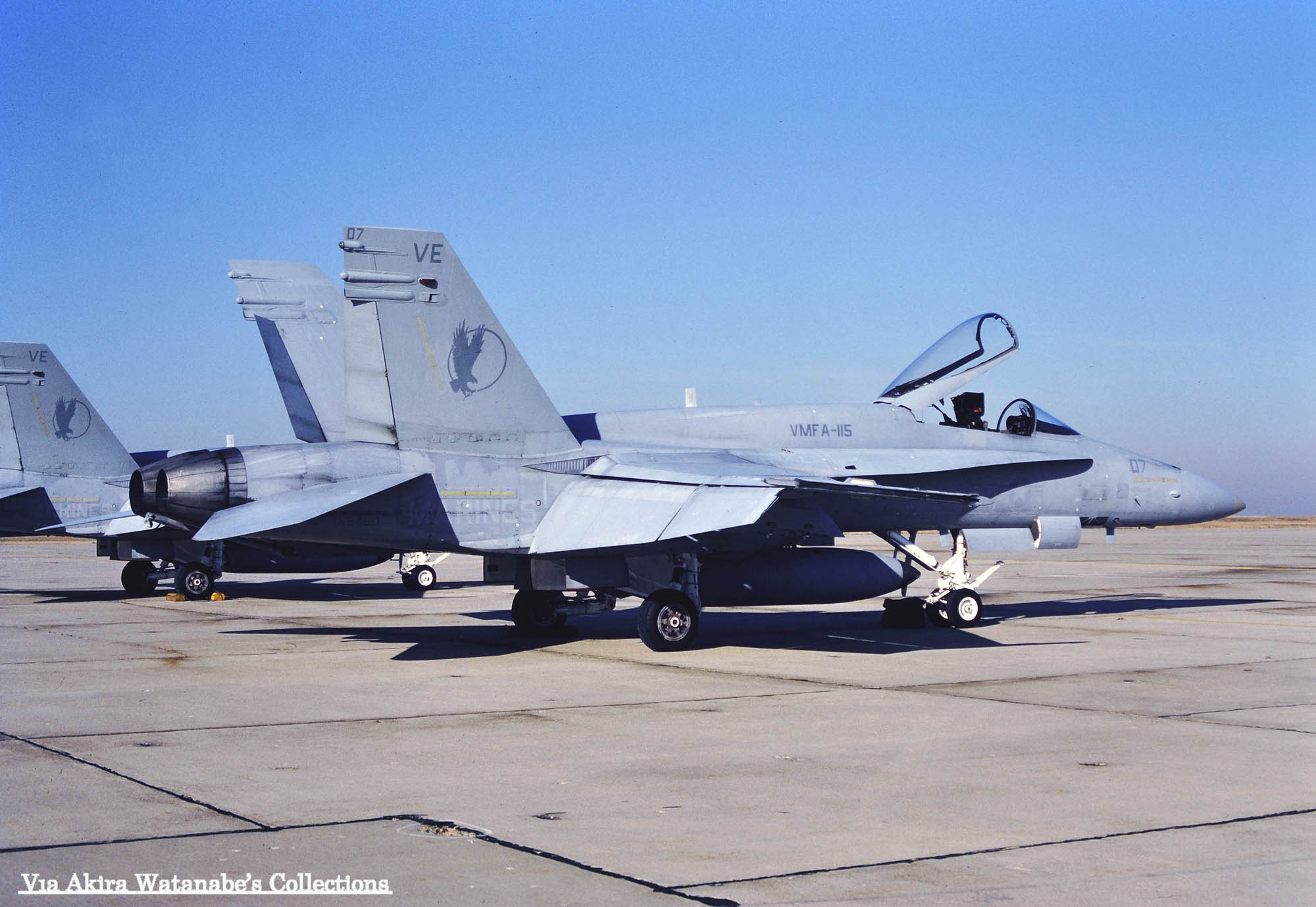 ↑ 1985年9月に撮影されたVMFA-115のF/A-18A/Bu.No.162460。撮影場所は不明であるが、恐らくアメリカ本国でのもので、機首番号もまだ未記入である事から、出荷された機体が部隊に到着して間もない頃の写真であろう。尾翼のイーグルも最初はこのようなデザインで塗装されていたと言う貴重な記録である。因みにこの機番のFA-18Aは日本に最初に派遣された時、”VE-07”とされている。