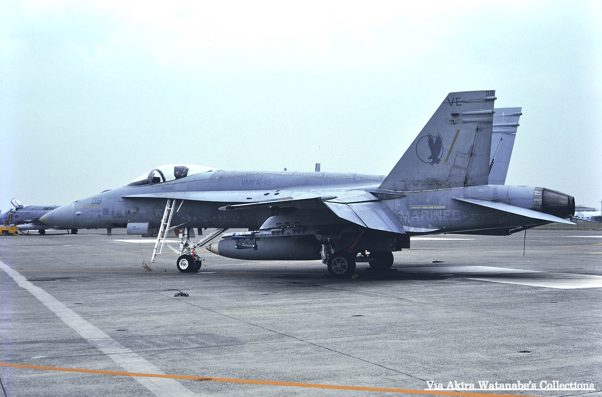 ↑ 同日にVE-08とペアで飛来着陸したVE-05。VMFA-115の岩国派遣4度目が1993年夏であるから、初回の派遣機とは大分機体が入れ替わっているはずで、尾翼の機番表記も僅かながら異なっている。