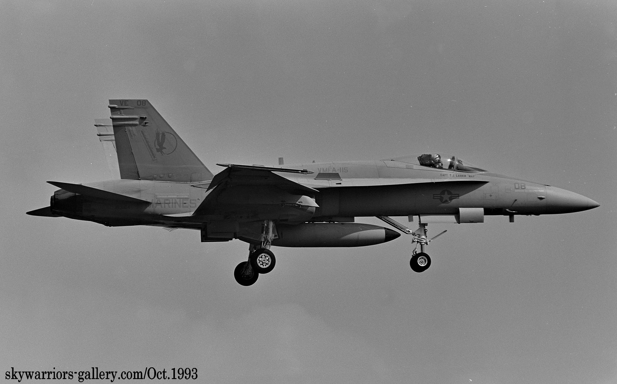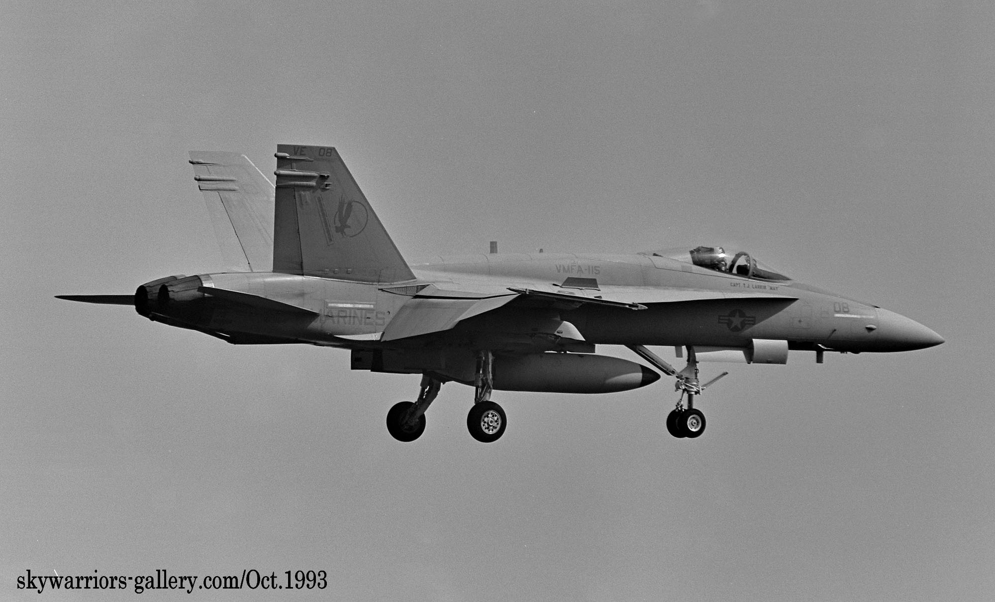 ↑ 1993年10月 厚木基地に飛来したVMFA-115のFA-18A/VE-08。私が初めて撮影したVMFA-115所属のFA-18Aだったと思う。ビューアルナンバーは読み辛いが末尾が164なので、163164だと推測。