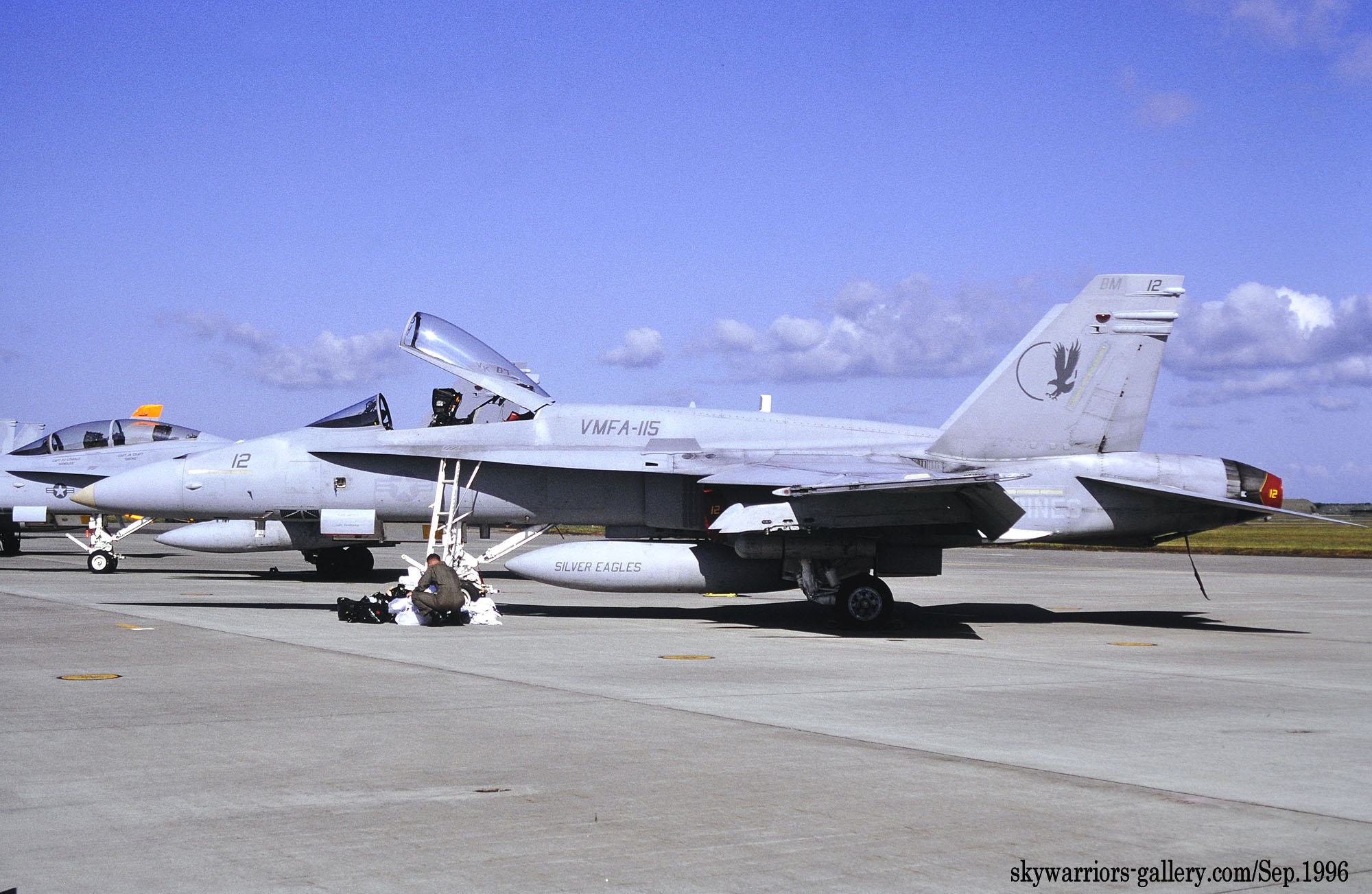↑ 1996年9月の三沢基地航空祭に展示されたVMFA-115のFA-18A/BM-12。各所に書かれた番号等は字体も細く、また色も薄い。