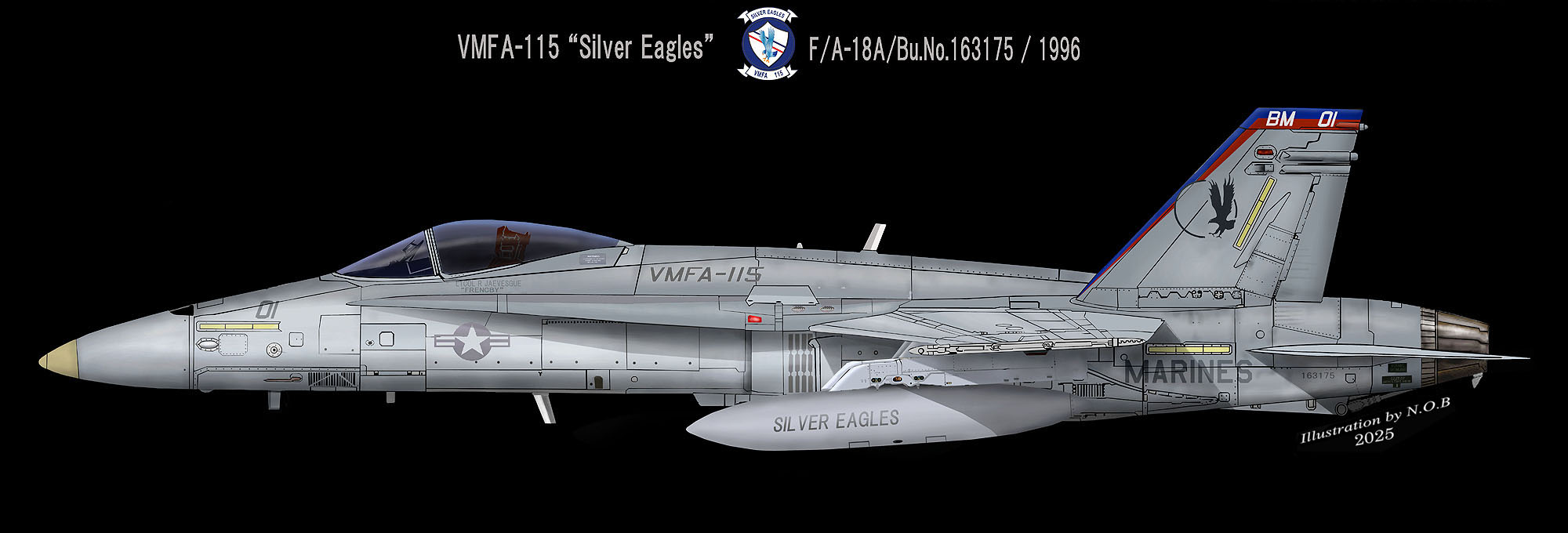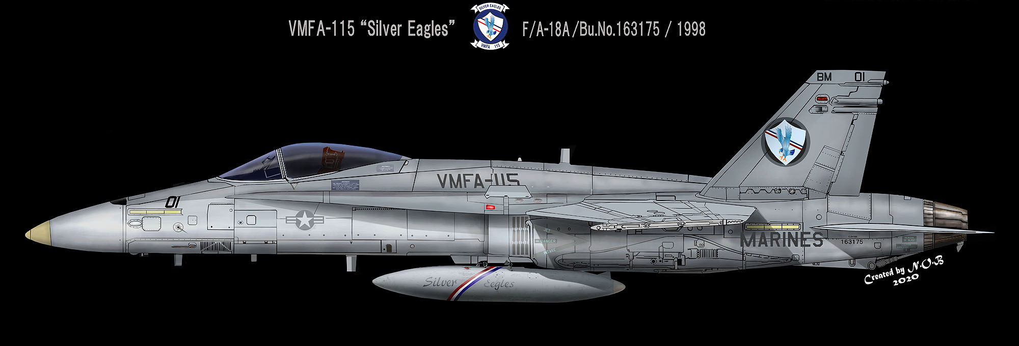 ↑1998年頃のVMFA-115司令官指定機で尾翼に部隊インシグニアを丸丸挿入したタイプ。燃料タンクにもトリトコール(三色旗)と部隊ニックネームが入っている。F/A-18A/VE01/Bu.No.163175