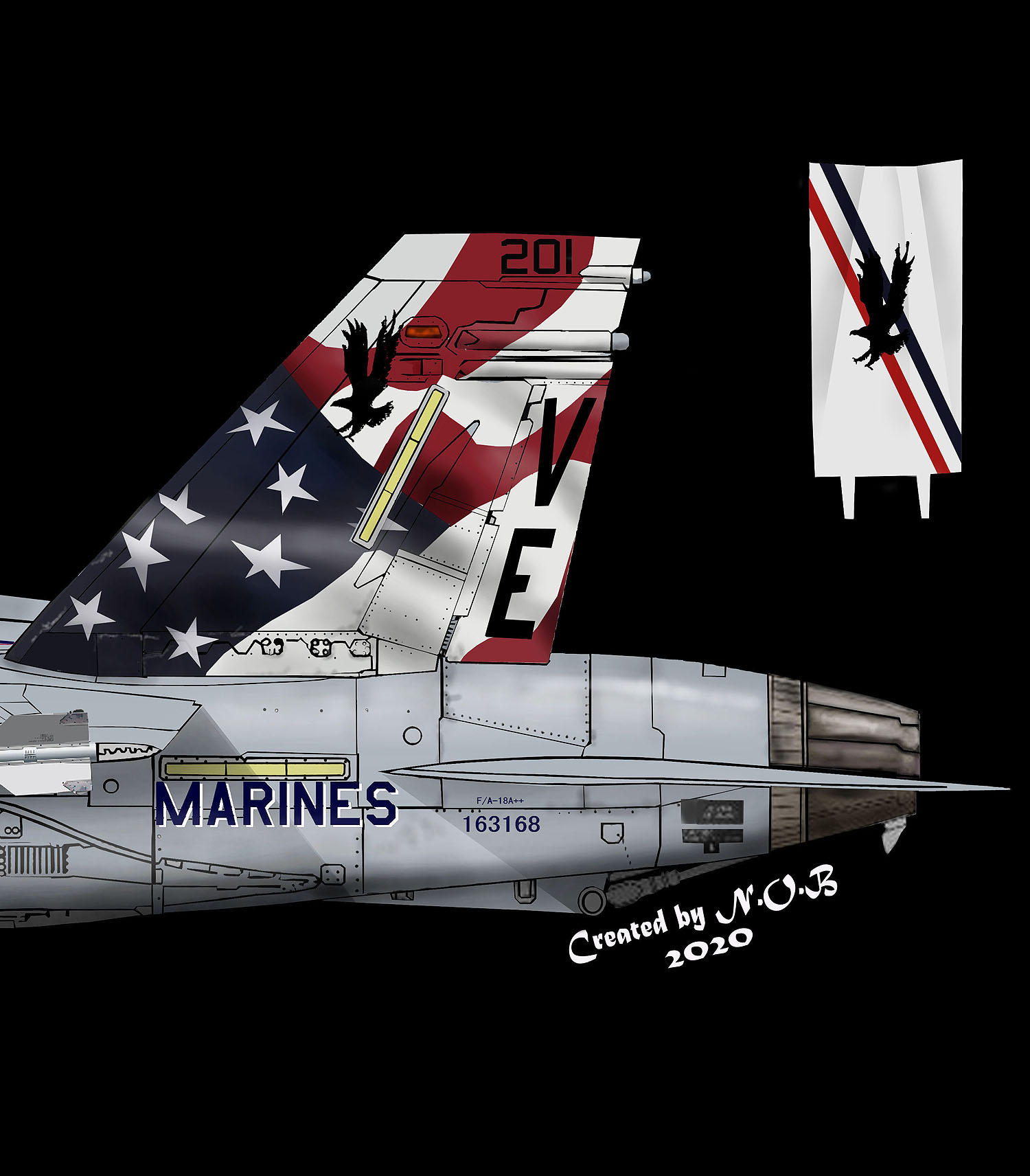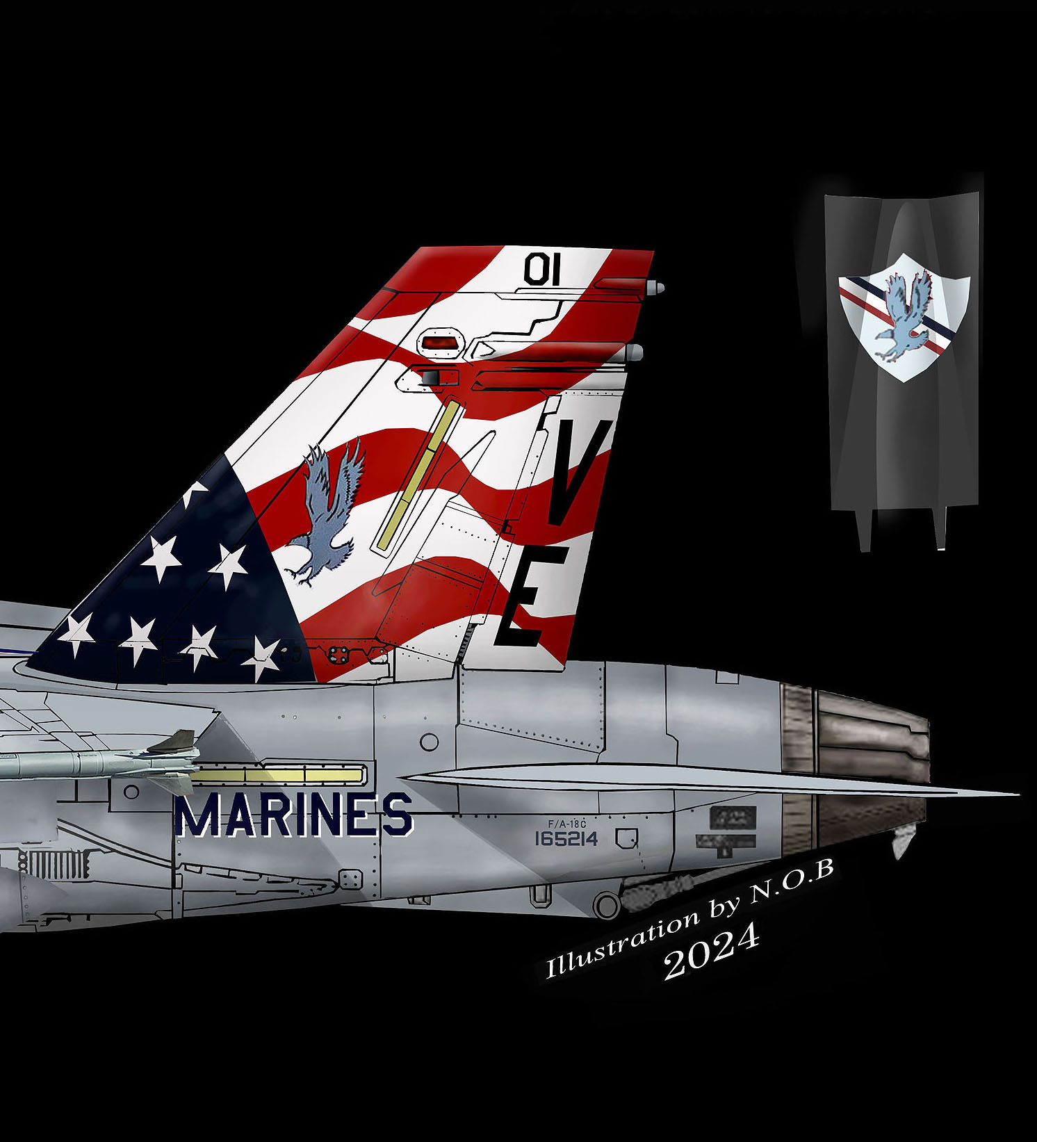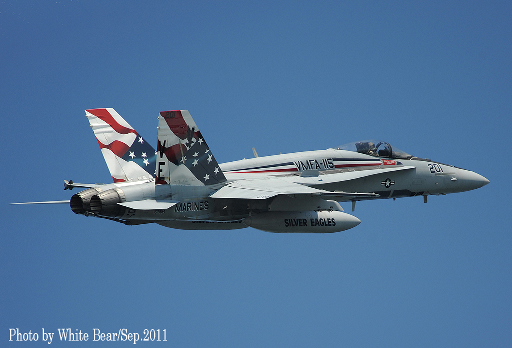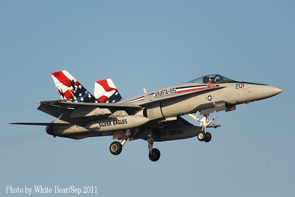 ↑ 2011年9月に再びVMFA-115のFA-18A++12機が岩国基地に飛来した。今回はVE-201/Bu.No.162884は最初から星条旗のマーキングを入れており、このマーキングでは第2代目となる。FA-18Aは、+が++に更新されている事に注意