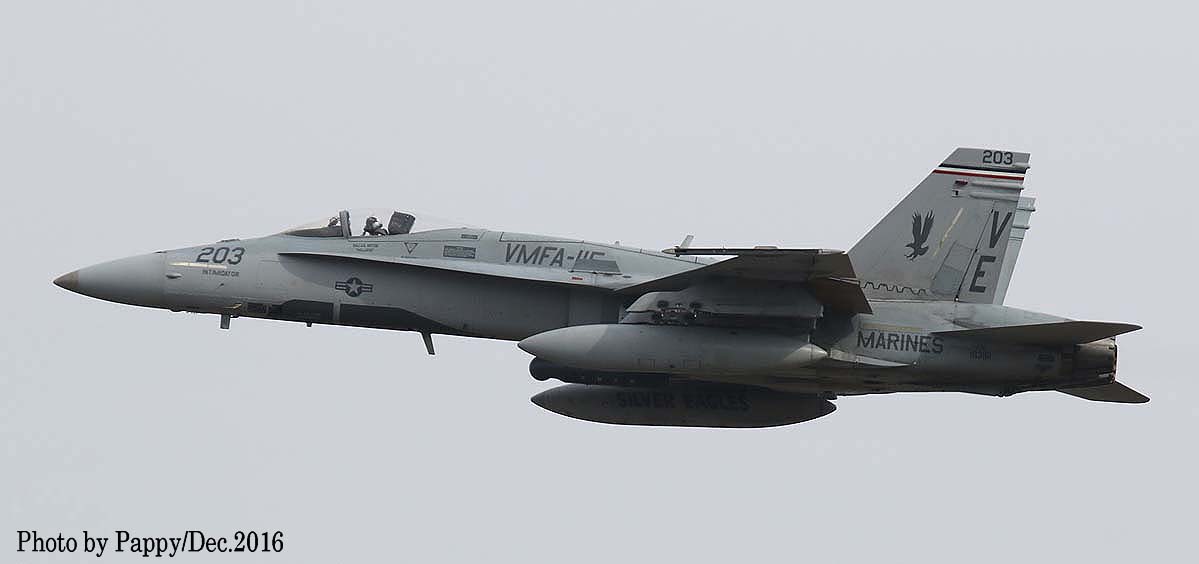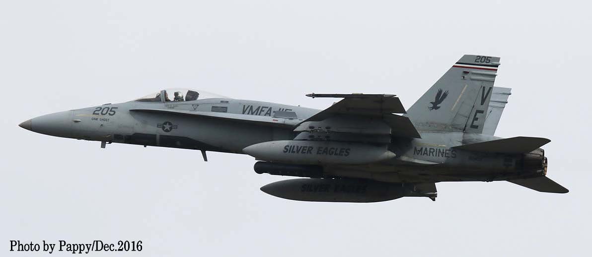 ↑ 2016年12月4日 横田基地を離陸する4機のブレード。写真は、友人故PAPPYさんから送って頂いたもの。前日3日15:45分に横田基地に飛来したVMFA-115の4機のFA-18は、ローカルフライトも無しに翌日横田を離れた。その後、離陸した4機の内、唯一のC型であった星条旗マーキングのVE-201/Bu.No.163755は事故で失われパイロットの死亡が確認されたそうで、ご冥福を祈りたい。尚 上のイラストの機体は、この機体が失われた4年後に来日した際のものである。