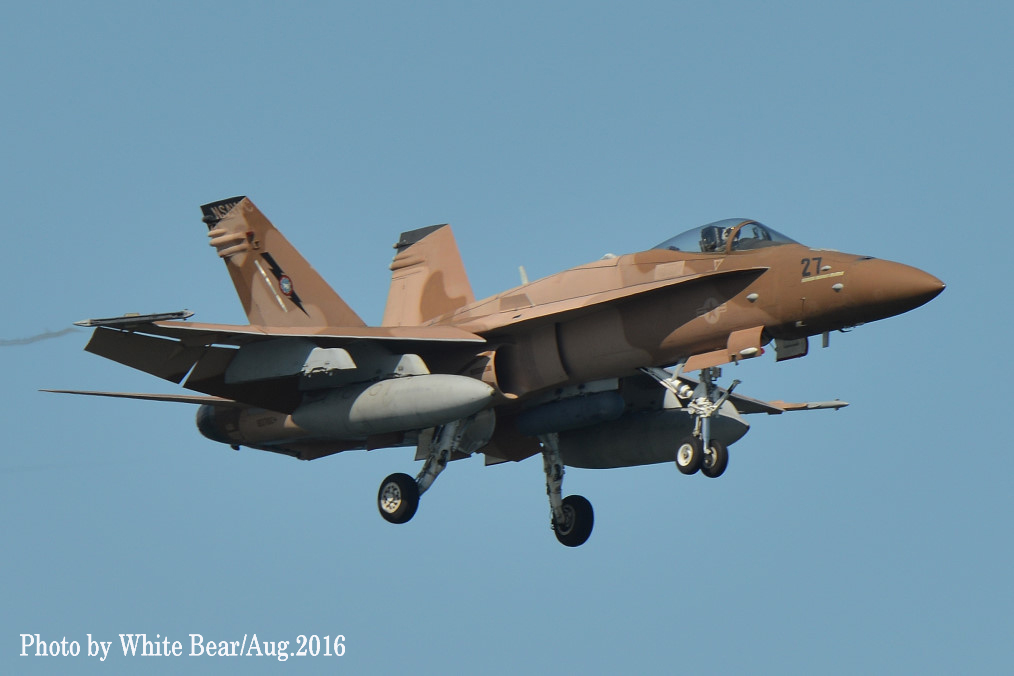 ↑ 前項でご説明した2016年に岩国基地に展開したVMFA-115の12機のFA-18の中に、2機のC型が含まれており、墜落したVE-201/Bu.No.163755とこの迷彩のFA-18がそうであった。NSAWCで使われていた機材を補充で当てたものと思われ、岩国ではVE-27号機として扱われた。White
