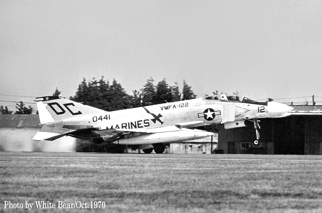 ↑White Bearさんが1969年3月に厚木基地に着陸するVMFA-122のF-4B。同隊は白いレードームの機体が多かった中で、レードームが黒く塗られた比較的珍しい機体である。