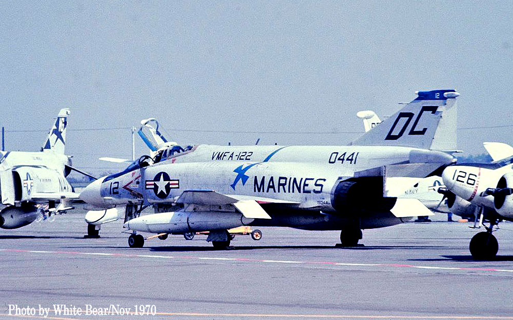 ↑ 1970年11月 横須賀に入港した空母アメリカが出港する際に、White Bearさんが厚木基地航空祭で撮影されたVMFA-122のDT-12/Bu.No.150441。航空祭の合間に着陸して来たそうである。エプロンで駐機しているF-4Bのバックに写るVF-96ブラックファルコンズのF-4Jと共に羨ましい情景である。