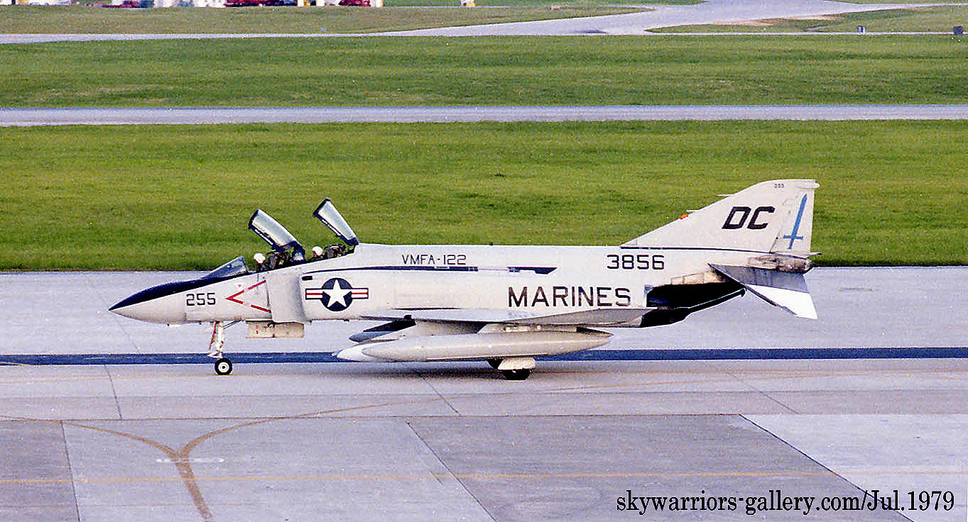 ↑1979年6月嘉手納基地のR/W23に向かってタクシングするVMFA-122のF-4J。センタータンクに剣持った十字軍戦士らしきシルエットが書かれている。ベトナム戦では彼らは、20mmガンポッドを多用した戦いをしている。