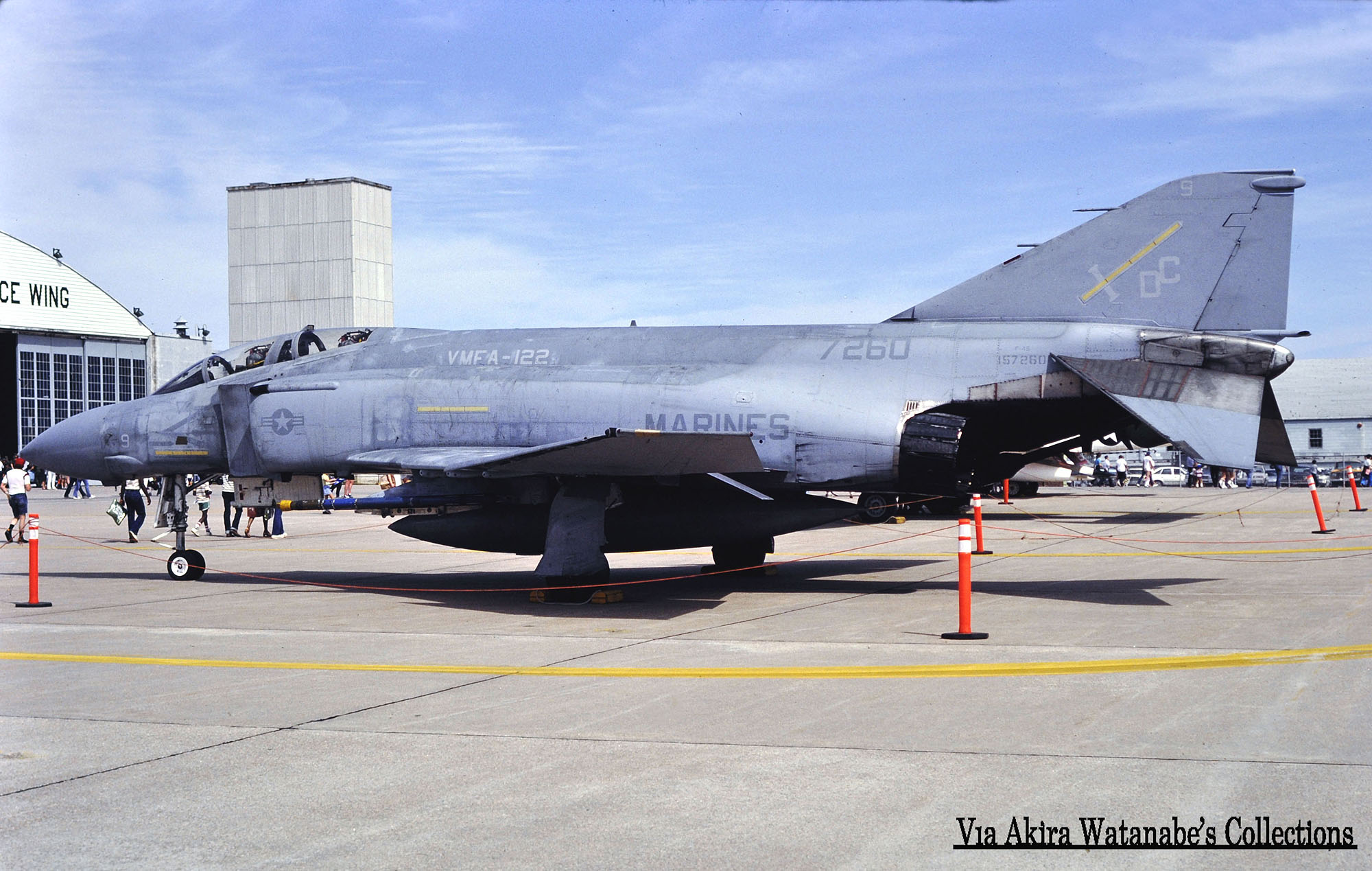 ↑ 1984年6月にオファット空軍基地で展示されたVMFA-122のF-4S。同隊がF-4S型に更新された後の写真は比較的少ないが、海兵隊の飛行隊の中では2番目に早くF/A-18Aに更新されため、S型の使用期間が短かったためかもしれない。写真のF-4S/Bu.No.157293は、Mig撃墜マークを付けているが、1972年9月11日同機がVF-31時代にMig-21をAIM-9サイドワインダーミサイルで撃墜している事を示している。