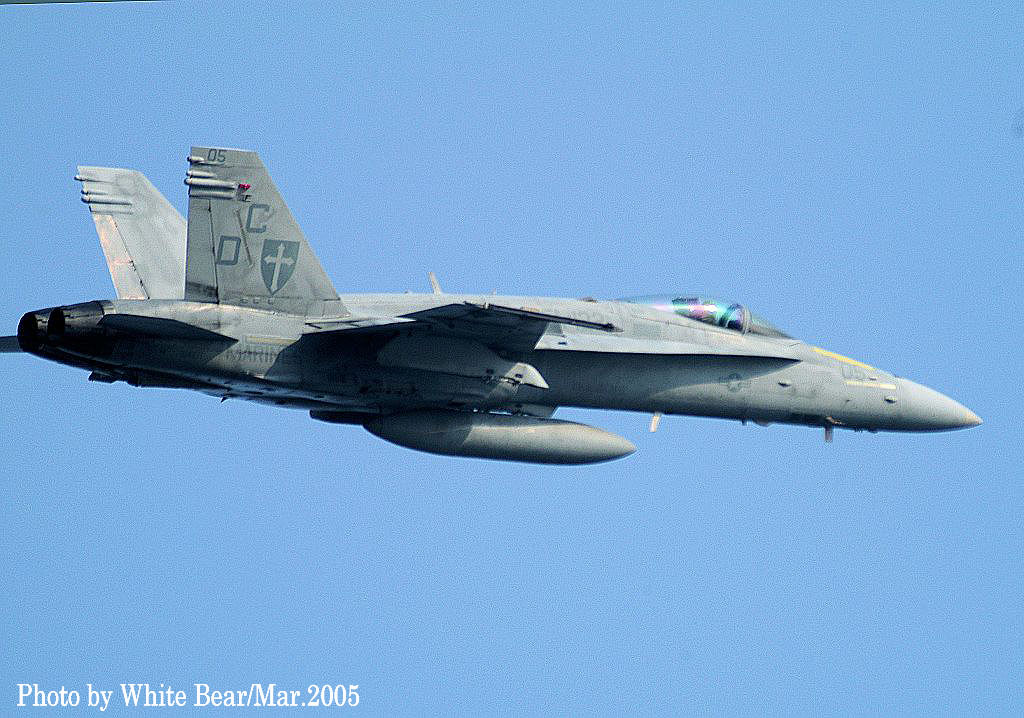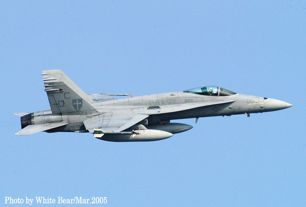 ↑ 2005年5月にWhite Bearさんが岩国基地で撮影されたVMFA-122の十字軍風マーキング。数多きFA-18のショーバードの中で最も人気の高かった塗装の一つで、曲線を上手く使った非常に良いデザインである。胴体下の燃料タンクには星条旗が書かれ、"Crusaders"と黒色で書かれている。