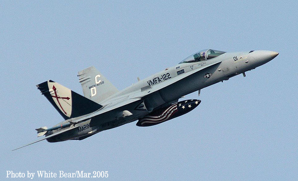 ↑ 2002年横田公開で展示されたDC-01に引き続き、2004年はより派手になって、ついに十字軍盾が尾翼全体に描かれるようになり このVMFA-122の司令官指定機の塗装は、この後の部隊マーキングに大きな影響を与えた。VMFA-122 F/A-18C Bu.No.164264