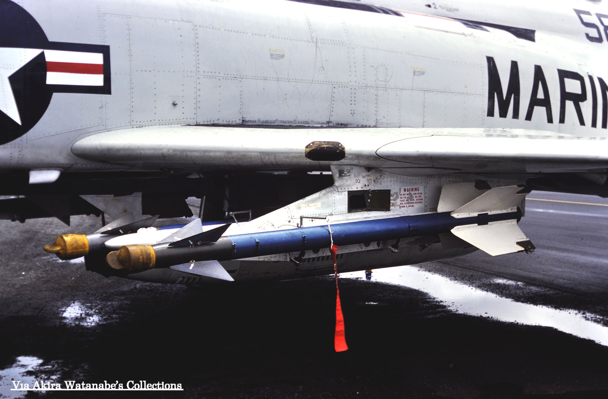 ↑ 1979年12月岩国基地で撮影されたVMFA-212のF-4Jに付けられた赤外線誘導ミサイルAIM-9G サイドワインダーのシーカー付訓練弾。AIM-9サイドワインダーミサイルの第2世代にあたり、D型と外形は同じであるがアンケージドシーカーが追加されて、機首のレーダーと連動でき、ミサイルの赤外線シーカーだけに頼っていたD型の撃墜範囲を広げている。つまり、ボアサイトの先駆けと言う訳である。ベトナム戦争で「役に立たないミサイル」と評判の良くなかったB型をより機動性や命中精度を上げたD型を更に改造したタイプである。実弾の弾頭重量は約88㎏であるから、大柄の人間なら2人で運べたが、甲板では用心の為3人で装着する。ミサイル本体には近接信管が付いており、直撃にならずとも5mで敵機を感知して爆発するように設計されている。因みに第2世代位まではアメリカ空軍は記号の違う別のタイプを使っていたが、次第に海空軍共通のものを使うように改善された。