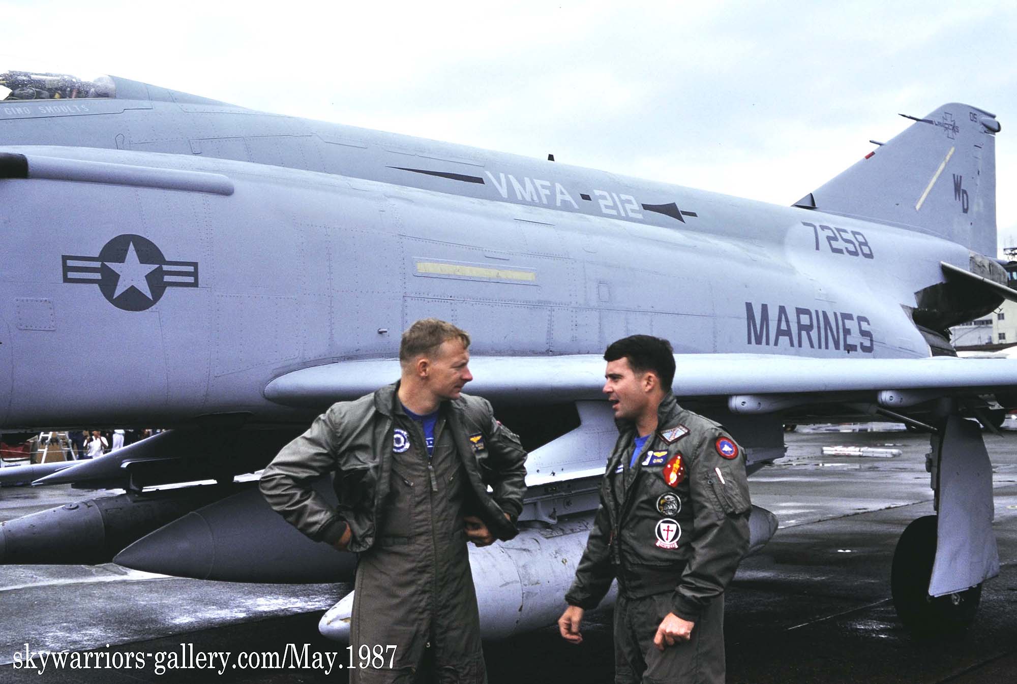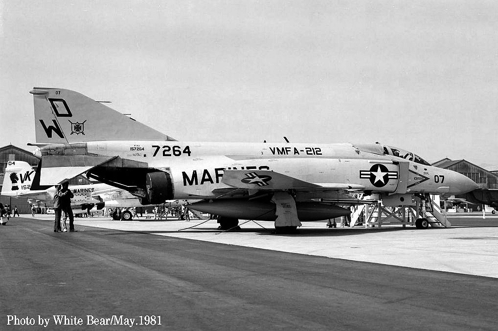 ↑ 1981年5月岩国基地の航空祭に展示されたVMFA-212のF-4J/WD-07。この機体は数年後にS型に改良されて海軍のVF-151(厚木基地)に配属されている。後ろには真っ白な尾翼のVMA(AW)-121のA-6Eが見える。White