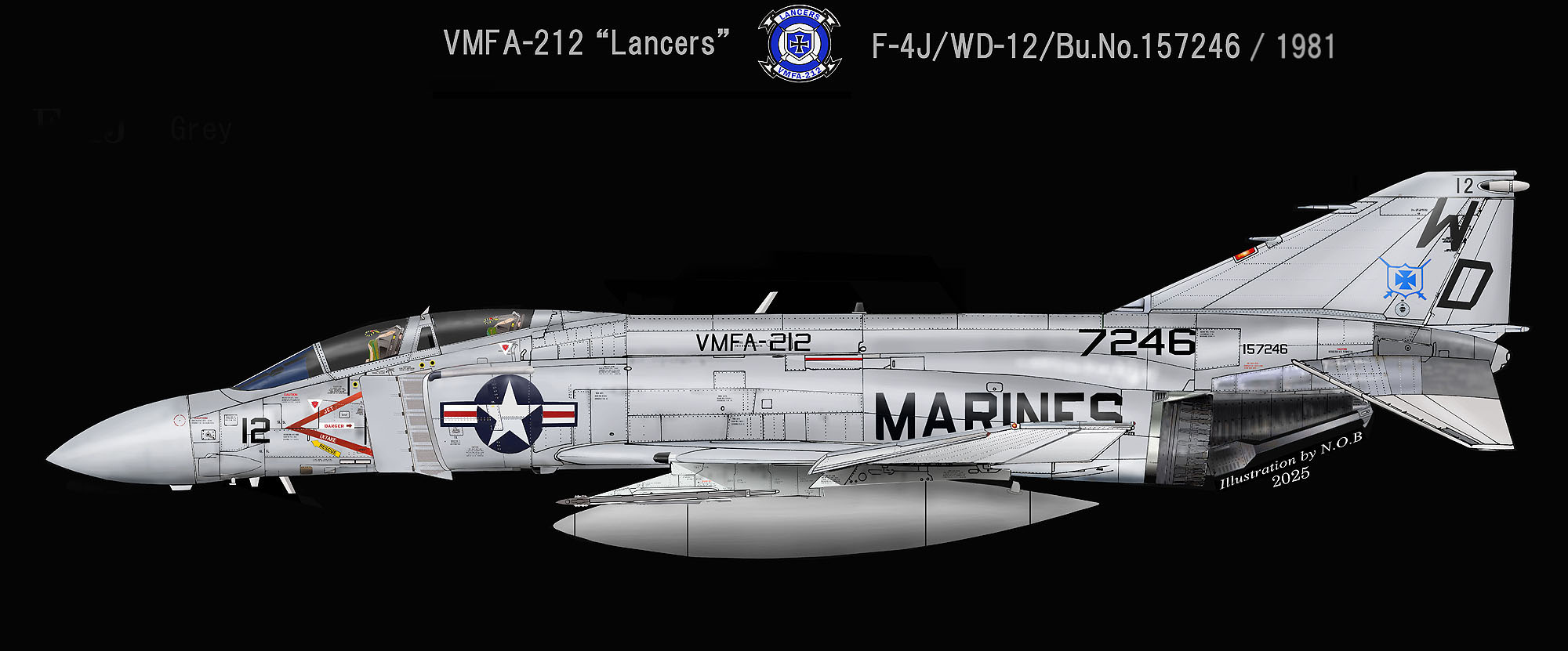 ↑1981年に岩国基地に派遣された際のVMFA-212のF-4J/WD-12。尾翼に小さいながらマリンブルーのインシグニアがランサーズの魅力が復活した。Modex-12は背中のVMFA-212の文字が何故か細文字であった。F-4J/WD-12/Bu.No.157246