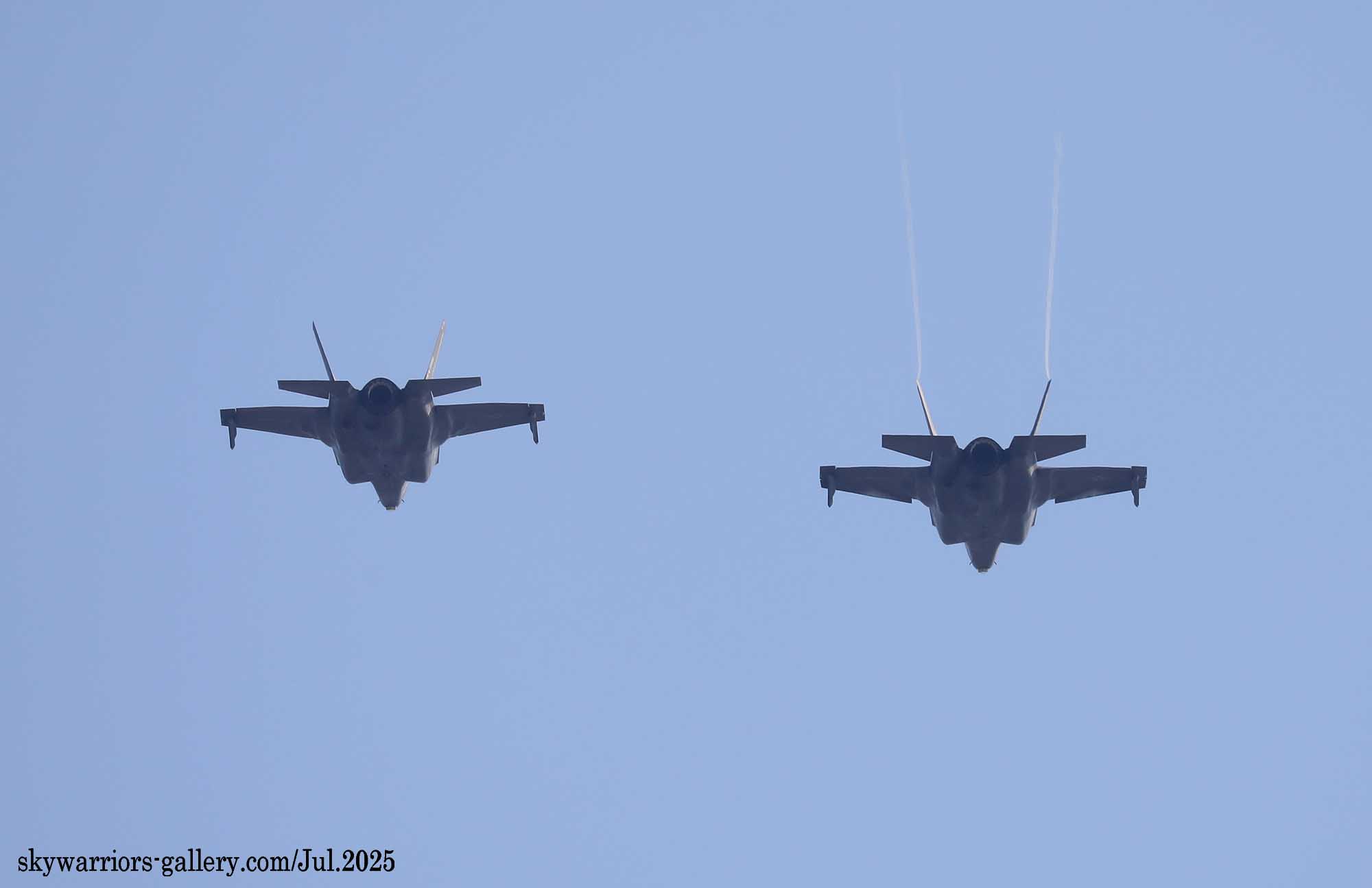 ↑ 2025年7月再び岩国海兵隊基地を訪れた。VMFA-121/242がグアム島へ出かけるなどして不在の中、VMFA-214/211が海兵隊航空部隊の訓練の中心となって活躍していた。上は飛行訓練を終えて岩国基地R/W-20上空をフライパスする2機のF-35B。
