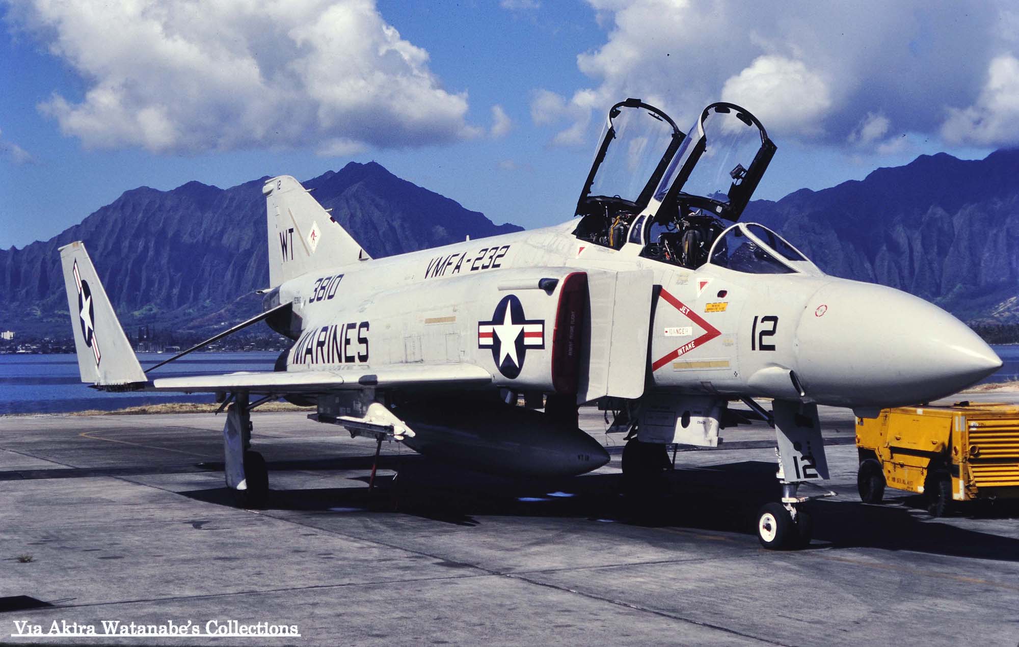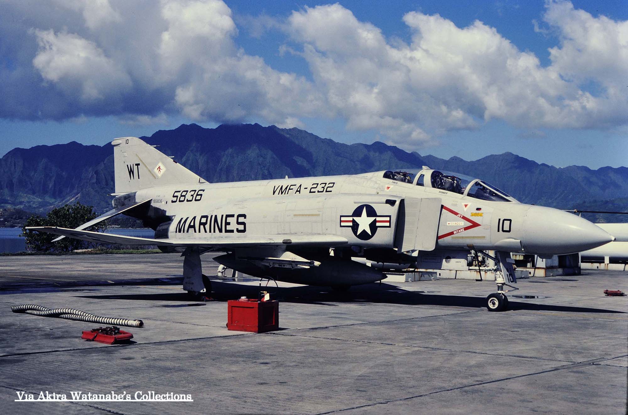 ↑ 上の2枚の写真は渡辺明氏のスライドコレクションから展示させて頂くが、場所はハワイのオアフ島にあるカネオヘ海兵隊航空基地でのもので、1981年4月の様子である。私も一度行った事があるが、ホノルルから北東に山を越えて走り、東側の海岸沿いにある基地で、確かタクシーで40分ぐらいの距離感の場所であった。火山噴火で生まれた山々に囲まれた海岸の平地に作られた航空基地で、風光明美な場所でもある。