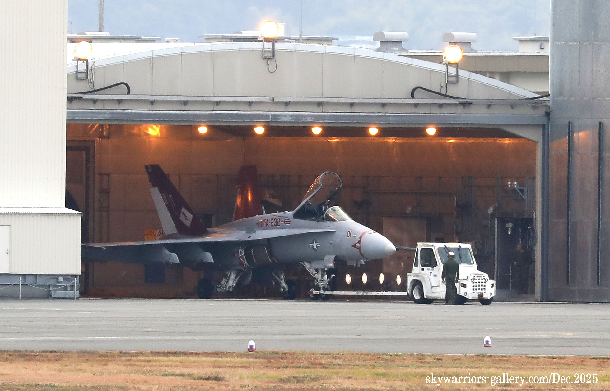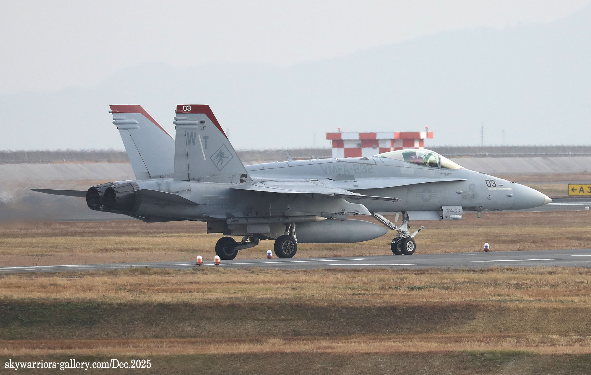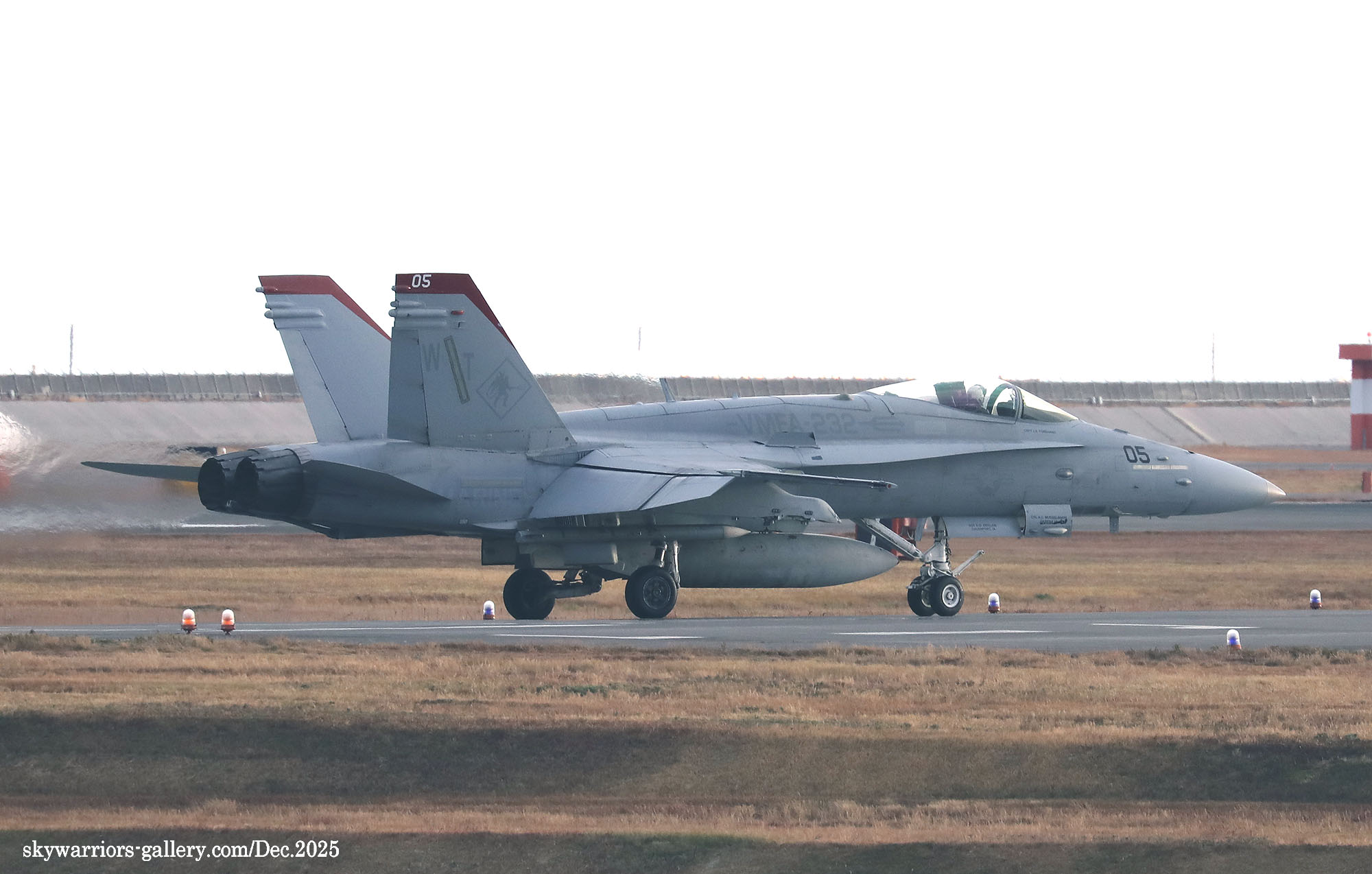 レッドデビルス創設100周年での岩国基地派遣、恐らく同隊のFA-18C/Dとしては最後の派遣となる今回、前項のWhite Bearさんの写真に刺激され、不肖私めも柳の下のドジョウを狙って12月の寒い岩国基地に展開したのであった。結果から申し上げれば”半分撃沈を食らって”帰ってきた・・・何とお目当てのWT-00/01が、私の展開した週は1度も飛ばなかったのである。其の他の機体はそこそこフライトしてくれたのだが、フルカラーの2機については横田基地飛来時も所用で行けなかった事に続き、縁が薄いのだと割り切るしかない。12月の岩国基地は天候が良かったが光線状態が悪い、特に午前から午後1時ごろまで厳しい逆光である。但し 2時以降太陽の傾きで機体の真横に強い光が当たり、綺麗な写真が撮れることがあるが、2時間余りの短い時間帯だけとなる。そんな初冬の岩国基地の様子をVMFA-232の活動を含め本項でご紹介したい。(2025年12月 記)