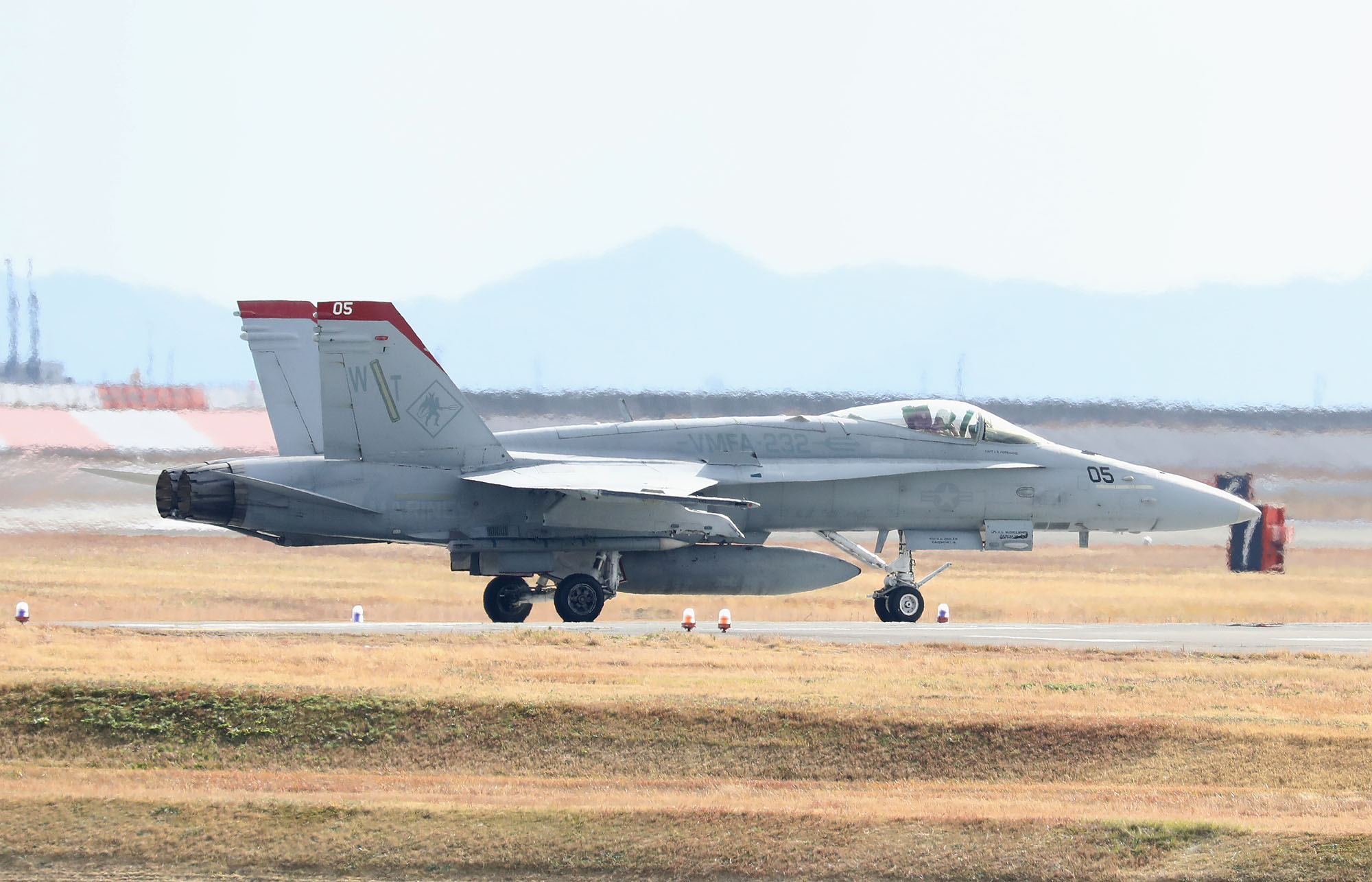 ↑ 飛行訓練を終えて岩国基地に戻ってきたVMFA-232のFA-18C/D。地元の人曰く、同隊がこのように4機のエシュロン編隊でランウェイエンド近くまで引っ張ることは珍しいらしい。