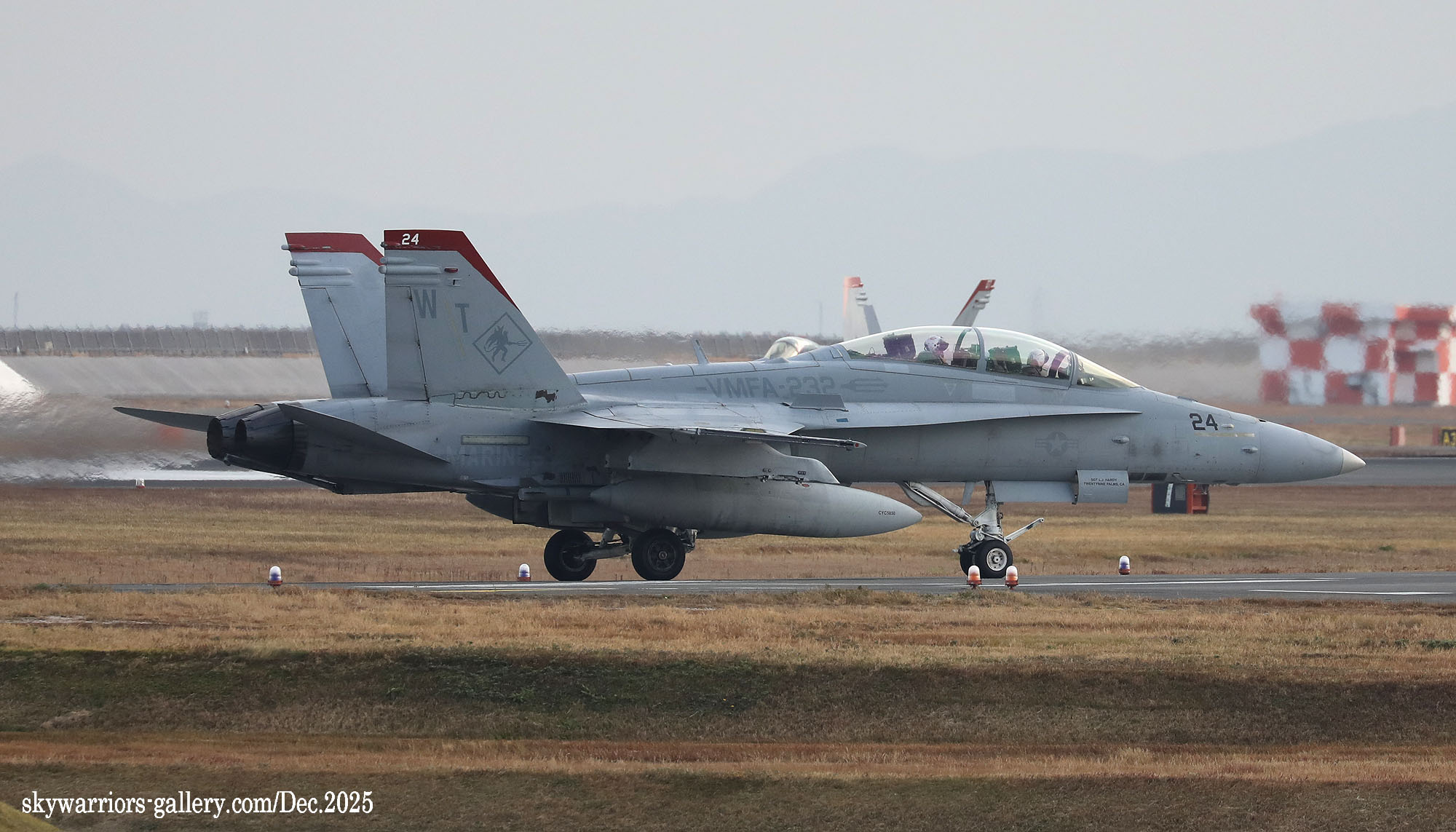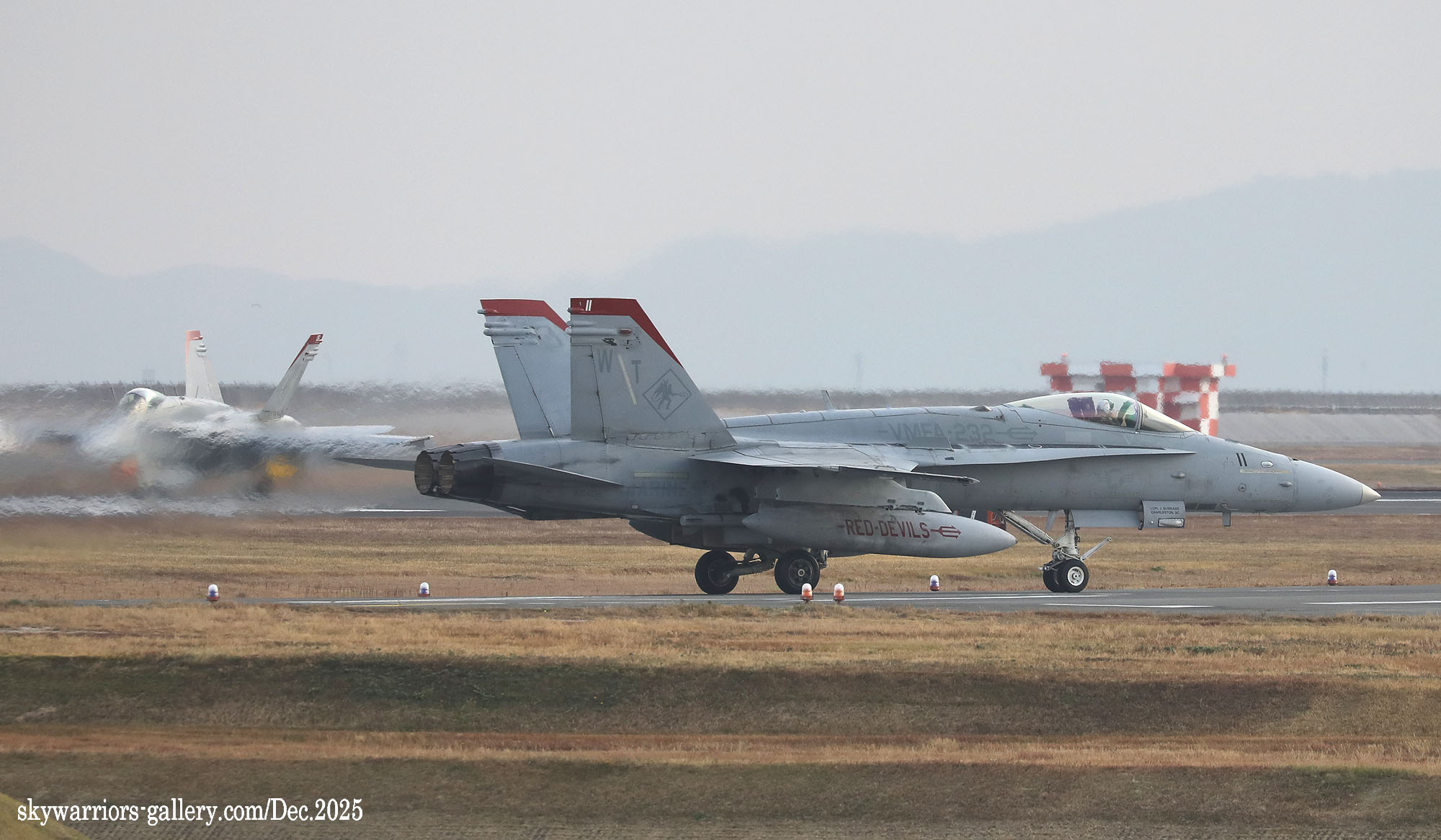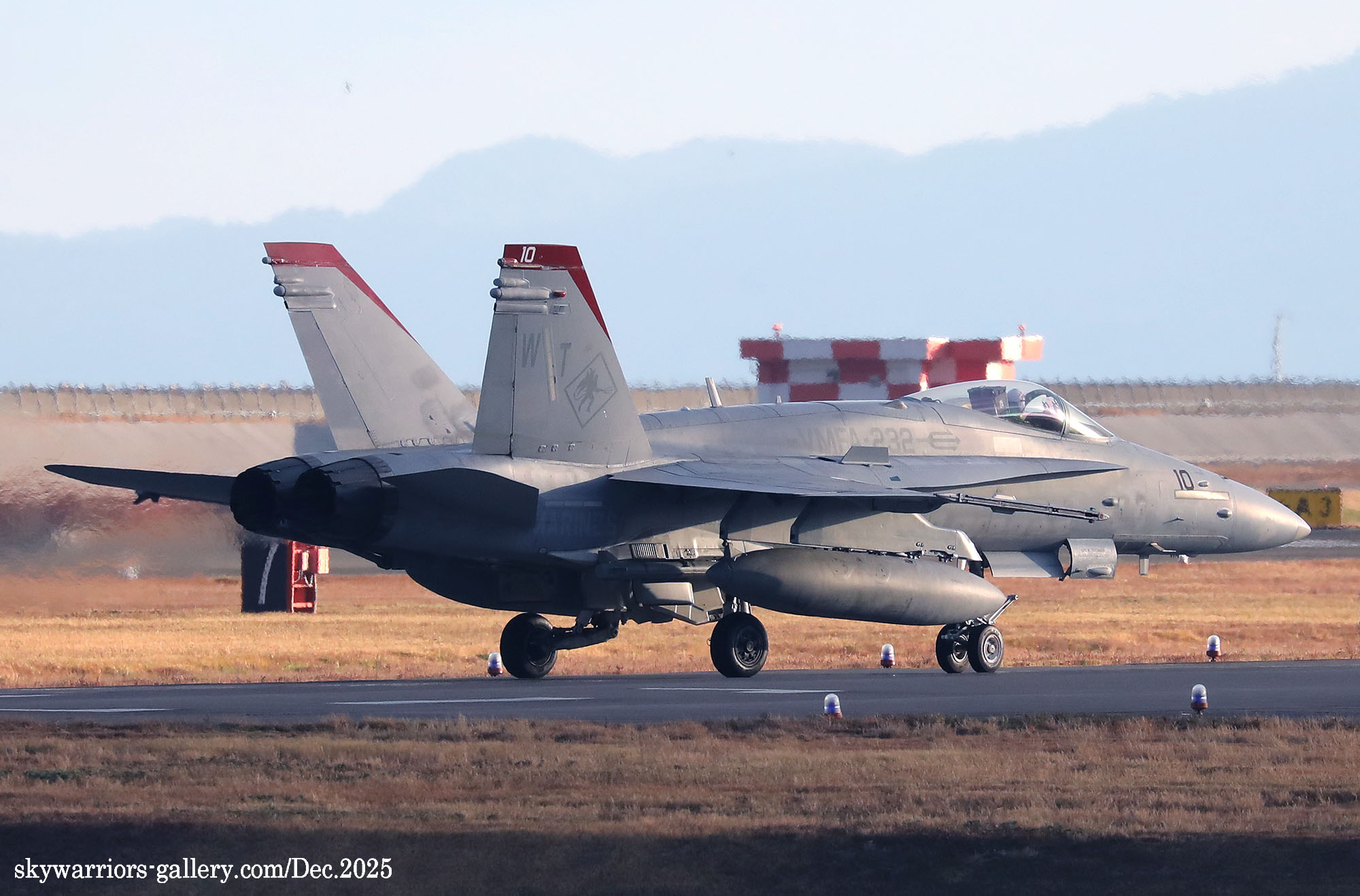 2025年12月1日~5日までの5日間、天候は大凡晴れで恵まれたが、3日から日本列島には大きな寒気が覆ったため、前日と比べ10℃も最高気温が下がると言う事態となり、3日夜には岩国市でも珍しく初雪が降った。岩国基地のF-35B部隊の1つは機体を強襲揚陸艦に出していた為全く此処での活動は無く、VMFA-232/121の訓練飛行だけがメインとなっていた。CVW-5は空母が沖縄の南側水域を北上している途中らしく、12月3日に7機の艦載機が先行で岩国基地に戻って来た。其の為明日にでもフライインかと期待されたが、私が居た金曜日までは動きは無かった。しかもVMFA-232の4機のFA-18Cは12月5日朝に厚木基地に向かい飛行して行ったため、岩国では当日は2機のFA-18Cがローカル訓練をしただけで、フライト数の少ない淋しい風景が流れていた。(2025年12月 記)