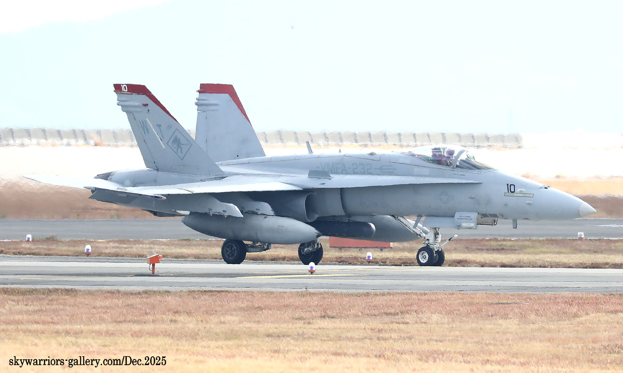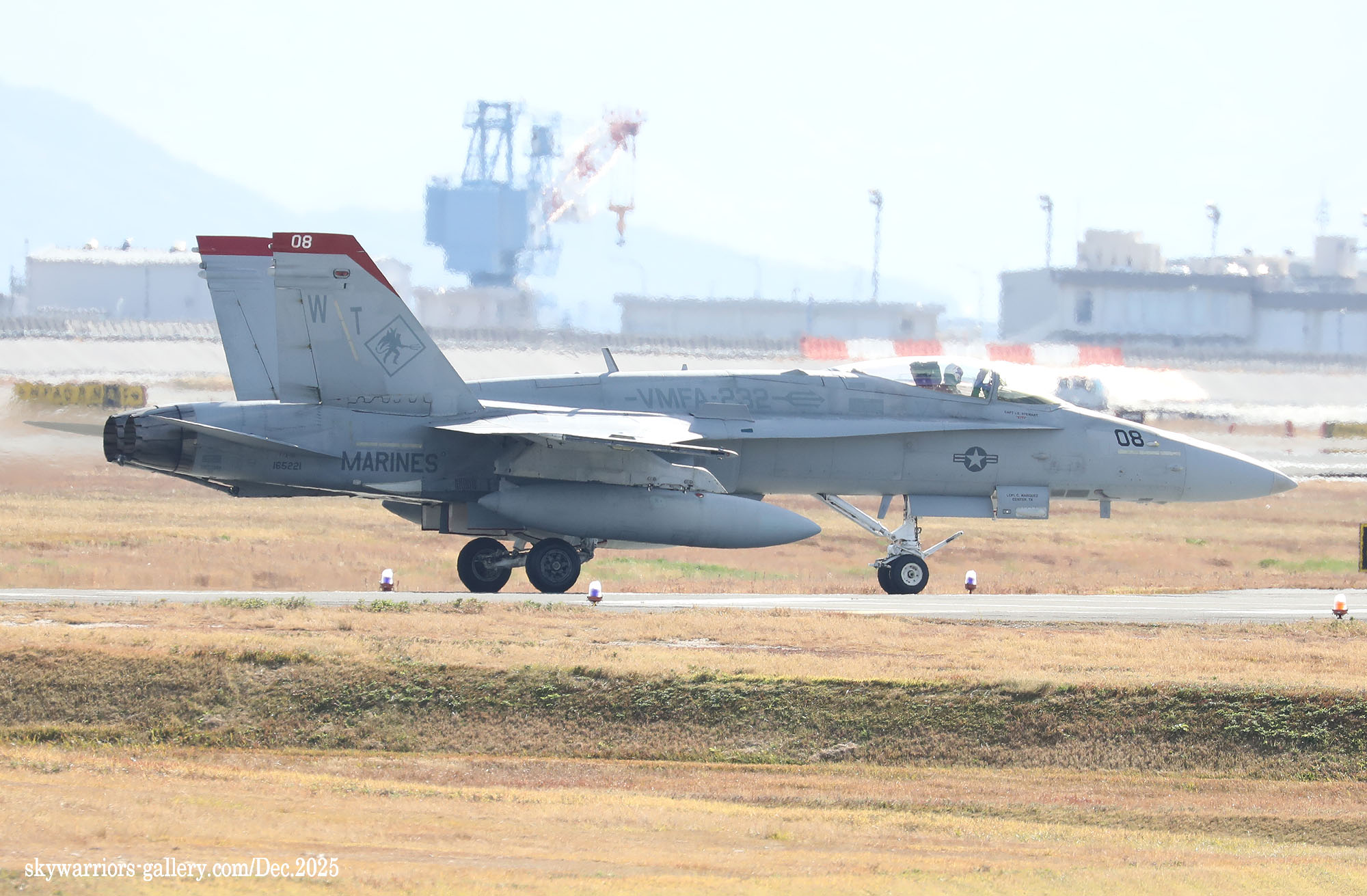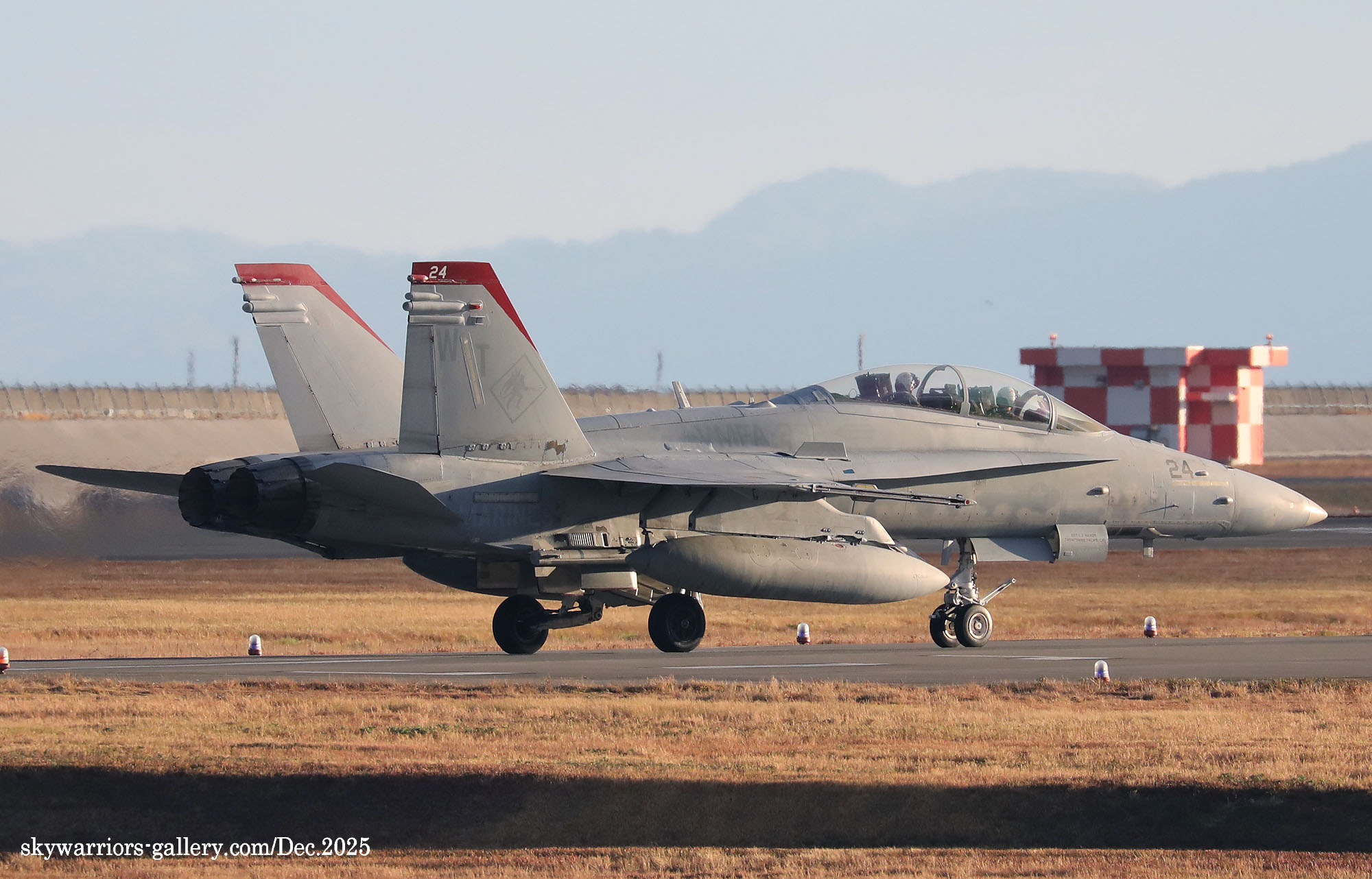 2025年12月1日~5日までの5日間、天候は大凡晴れで恵まれたが、3日から日本列島には大きな寒気が覆ったため、前日と比べ10℃も最高気温が下がると言う事態となり、3日夜には岩国市でも珍しく初雪が降った。岩国基地のF-35B部隊の1つは機体を強襲揚陸艦に出していた為全く此処での活動は無く、VMFA-232/121の訓練飛行だけがメインとなっていた。CVW-5は空母が沖縄の南側水域を北上している途中らしく、12月3日に7機の艦載機が先行で岩国基地に戻って来た。其の為明日にでもフライインかと期待されたが、私が居た金曜日までは動きは無かった。しかもVMFA-232の4機のFA-18Cは12月5日朝に厚木基地に向かい飛行して行ったため、岩国では当日は2機のFA-18Cがローカル訓練をしただけで、フライト数の少ない淋しい風景が流れていた。(2025年12月 記)