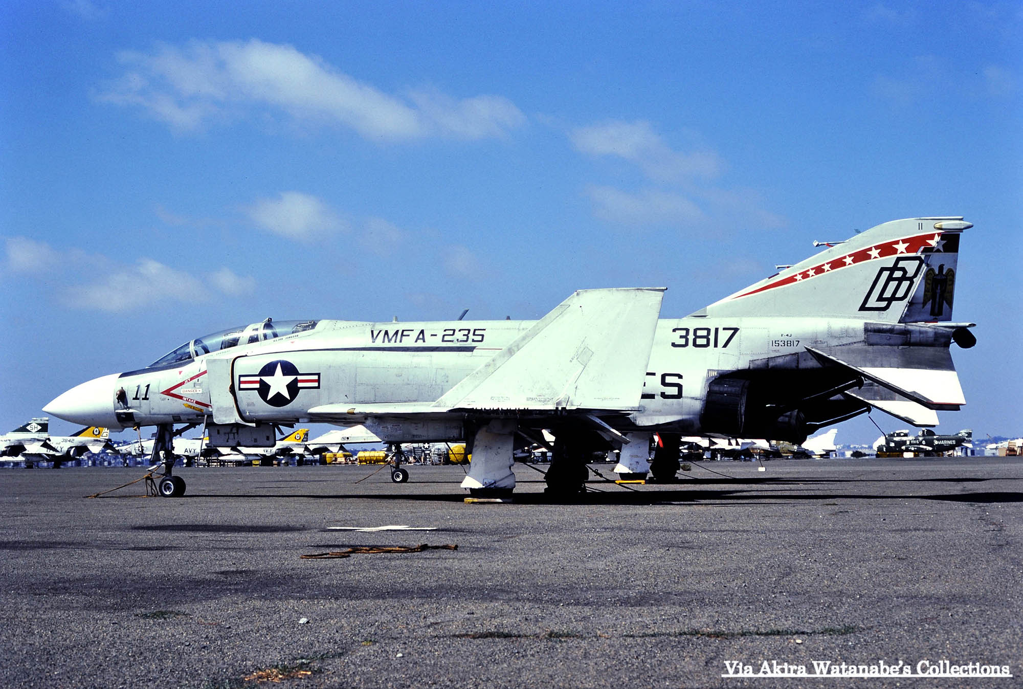 ↑ 上の2枚の写真は何れも渡辺明氏が、1975年8月にカルフォルニア州のノースアイランド海軍基地で撮影されたVMFA-235のF-4J/DB-11。既に赤いレードームのマーキングは無くなっていたが、尾翼にはディスエンジェルスが書かれている。