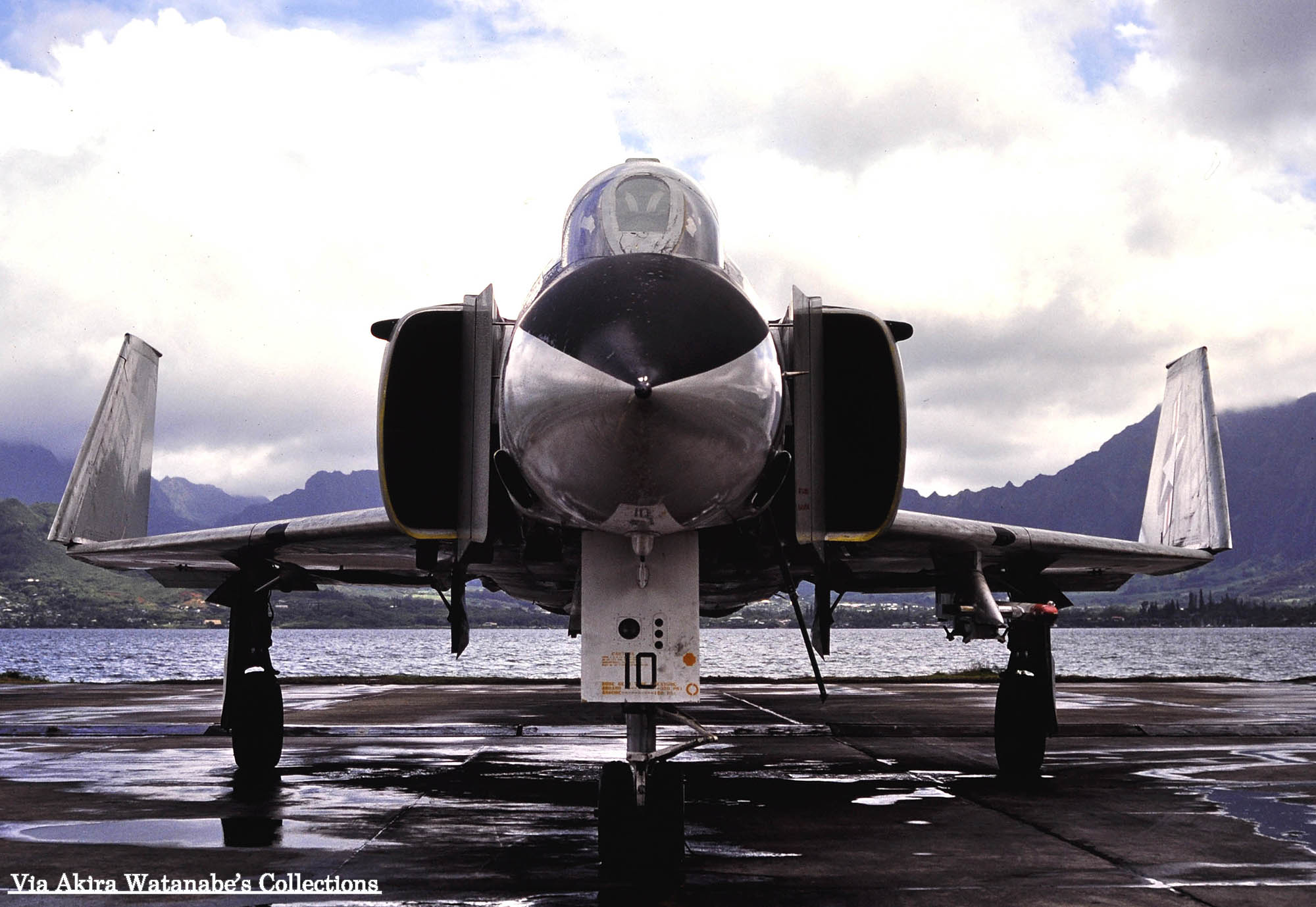 ↑ 基本的には一つ上のイラストと同じマ^キングであるが、テールコードの書き方が斜文字で、しかも文字を重ねる独特のスタイルに変わった。この部隊は殆どハワイを出る事が無かったため、海外での撮影記録が少ないが、1975年ぐらいまではレドームの塗装が残されていたようだ。F-4J/DB-1/Bu.No.153817